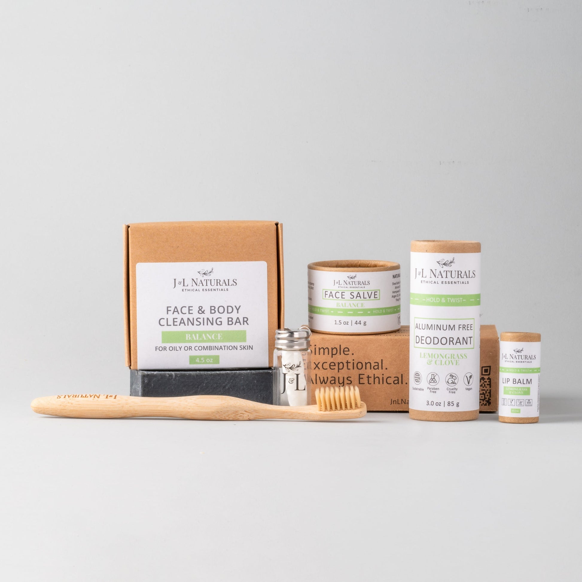 Includes: Cleansing Bar, Face Salve, Lip Balm, Deodorant, Bamboo Toothbrush, Floss, Cotton Buds.