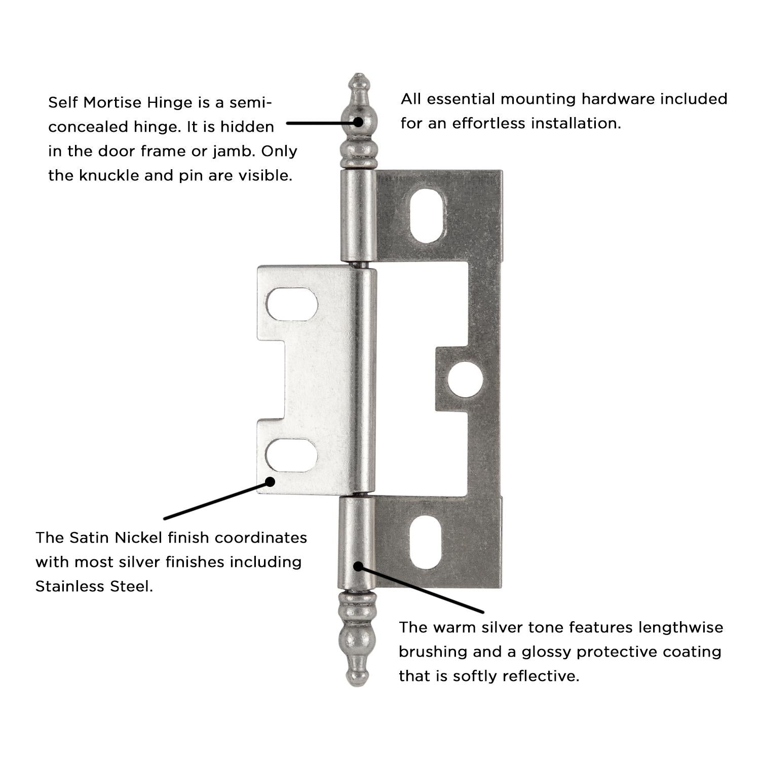 The Satin Nickel finish coordinates with most silver finishes including Stainless Steel. The warm silver tone features lengthwise brushing and a glossy protective coating that is softly reflective.