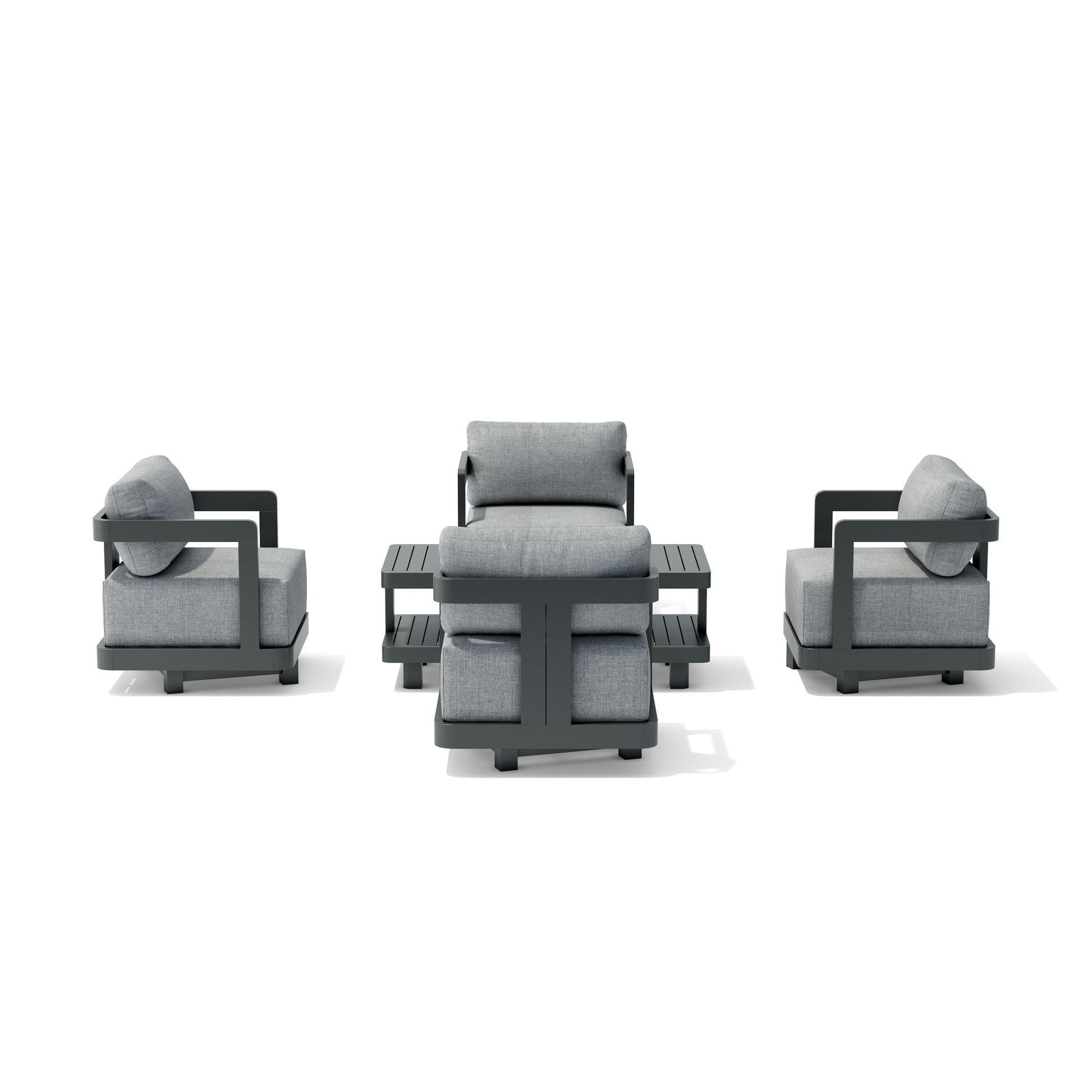 Sit back and enjoy the cool sunny weather in the comfort of your home and outdoors with this 5-Piece Granada Aluminum Swivel Deep Seating Set. Perfect for the yard and the outdoors, this collection is machine crafted from powder coated aluminum and finished in a dark grey color. Featuring four Granada Swivel Aluminum Armchairs, it has spacious seating measuring 26? W x 26½? D with 10½? thick cushions and pillow. Swivel mechanic rotates the chair up to 360 degrees and stays in place at any position. Also includes the two-tier Granada Rectangular Coffee Table.