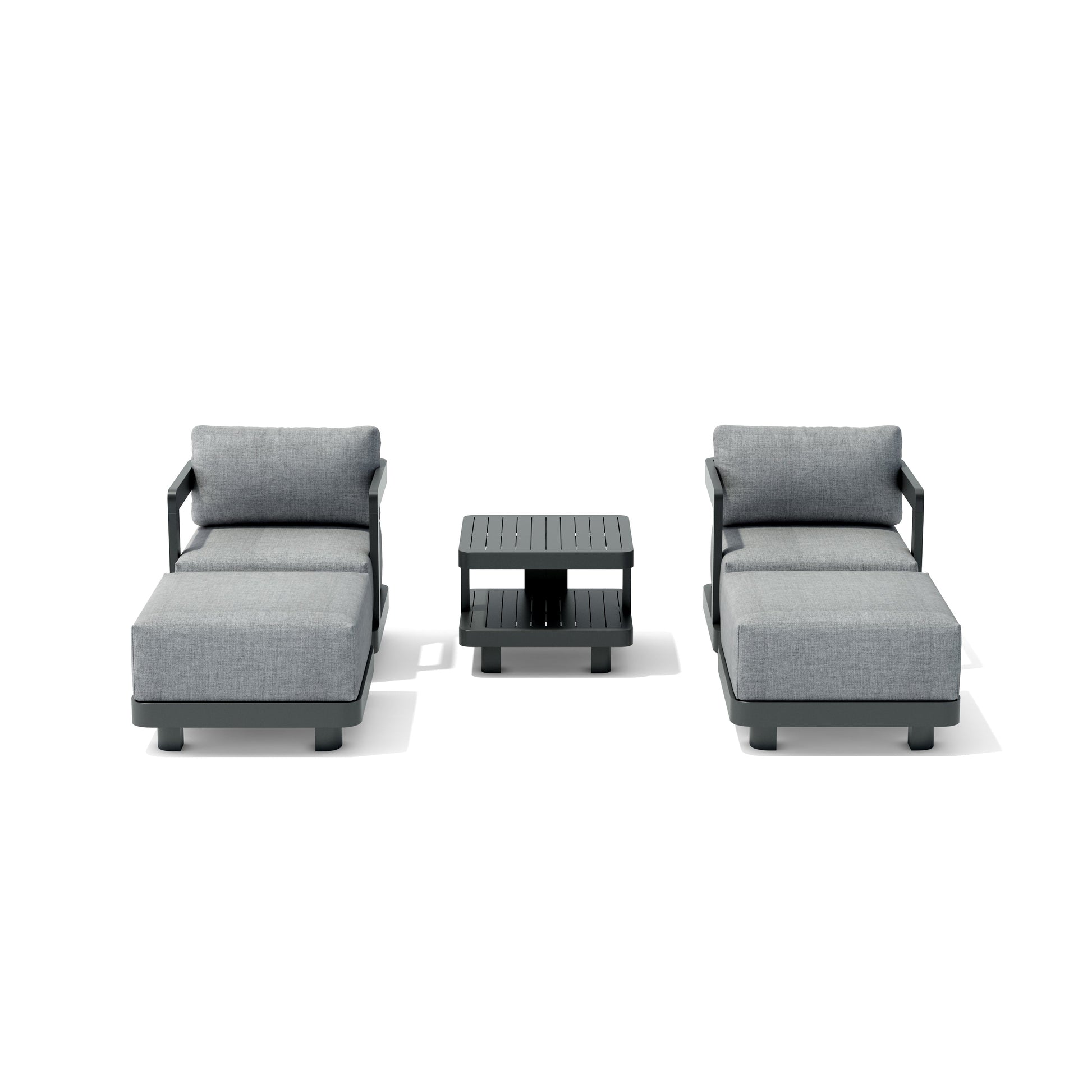 Rest weary legs on the ottoman and relax in deep seating comfort with this 5-Piece Granada Aluminum Swivel Set. Comfortable and stylish, it’s machine crafted from powder coated aluminum and finished in a dark grey color. The perfect place to spend a relaxing evening lounging, drinking, and chatting with a partner or friend, this set includes two Granada Swivel Aluminum Armchairs that rotates to 360 Degrees of movement that holds firmly in place. Featuring a spaciously large seating space measuring 26” in length by 26½” in depth and large cushions measuring 10½” in thickness, it also includes two Granada Ottomans and the matching 2-Tier Granada Square Side Table, perfect for placing snacks, drinks, or a book. Cushions from All-Weather Sunbrella fabrics included.