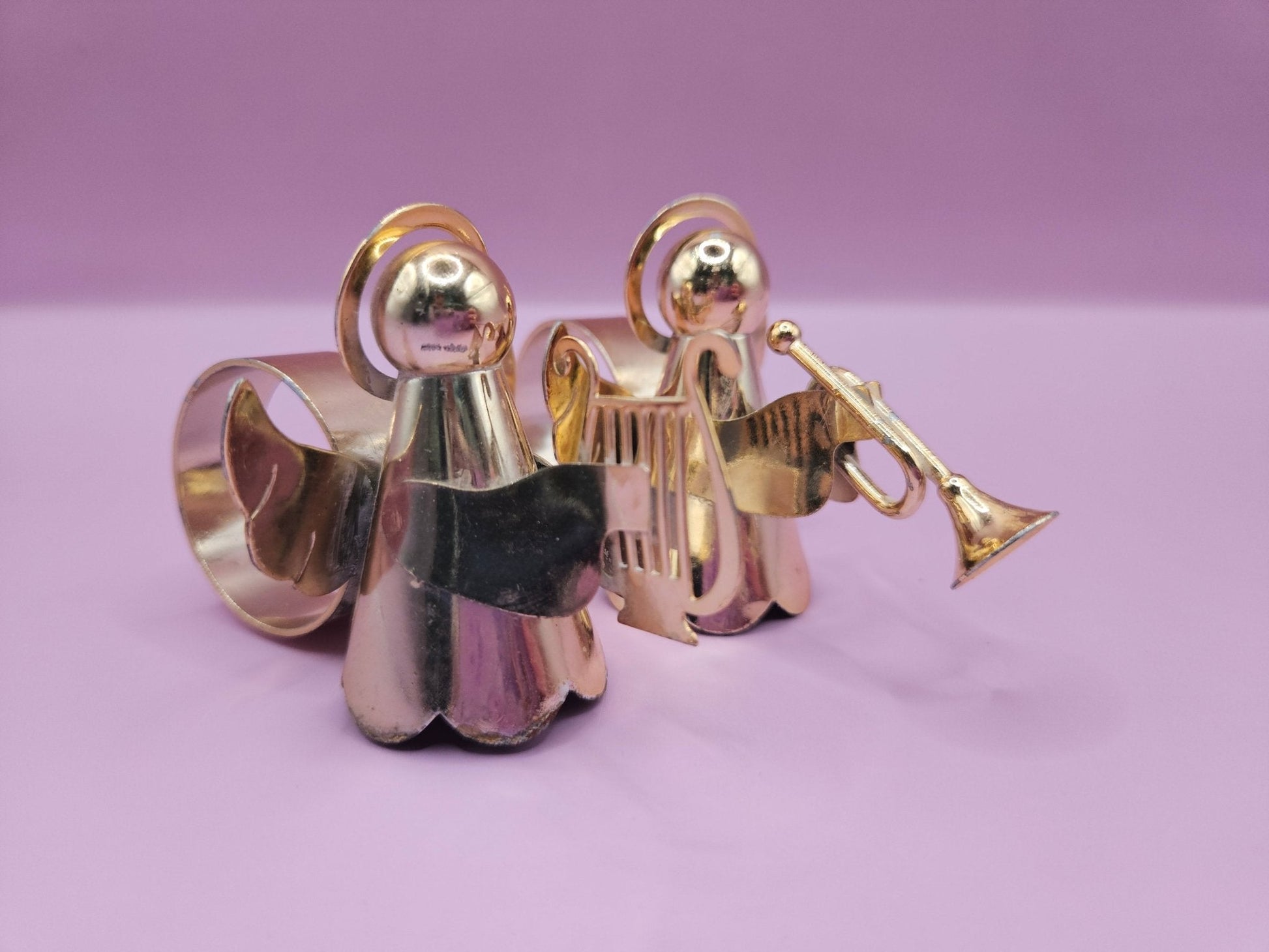 Add an elegant, festive touch to your dining table with this Set of 2 Vintage Gold Angel Napkin Rings. Each napkin ring features a beautifully detailed gold angel—one with a horn and the other with a harp—measuring 3.5". These napkin rings are perfect for holiday gatherings, special occasions, or as a unique collectible item. Their timeless design complements both traditional and modern table settings, making them a delightful addition to your decor.
