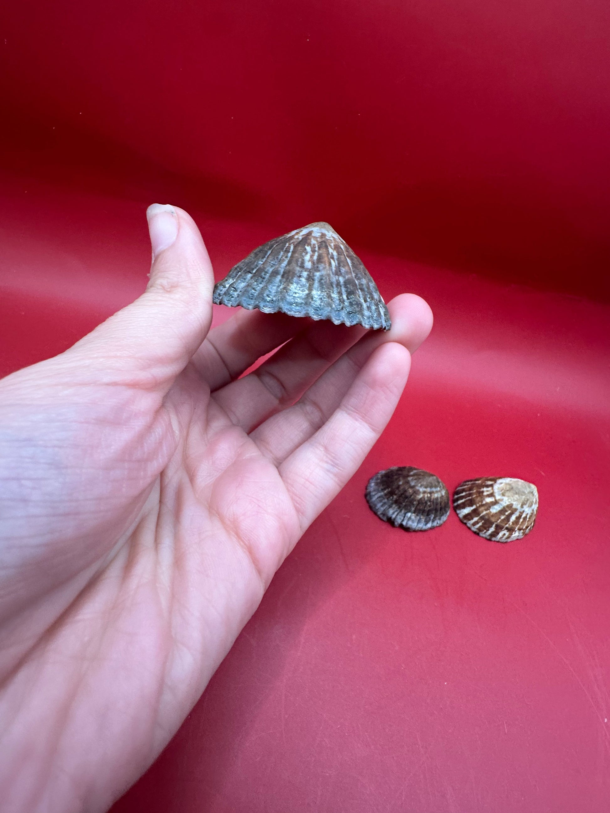 This striking set of four Nacella magellanica limpets showcases the rugged beauty of Argentina’s southern coastline. Collected intertidally during low tide at Punta María, Tierra del Fuego Province, South Atlantic Ocean, these specimens display bold radial ribs and natural color variations in earthy gray and brown tones. Each limpet retains its authentic texture and form, making this a premium set for collectors and coastal display enthusiasts alike.