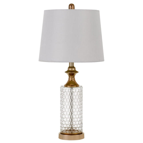 Brighten up your space with this pair of Glass Honeycomb and Rose Gold Table Lamps. The cylindrical shaped base features clear glass with a honeycomb design and rose gold/copper colored accents. A white tapered drum shaped shade is included to give these lamps the perfect look for your living room, bedroom, office or lounge. 26.5" x 13" x 13" each. Set of Two.