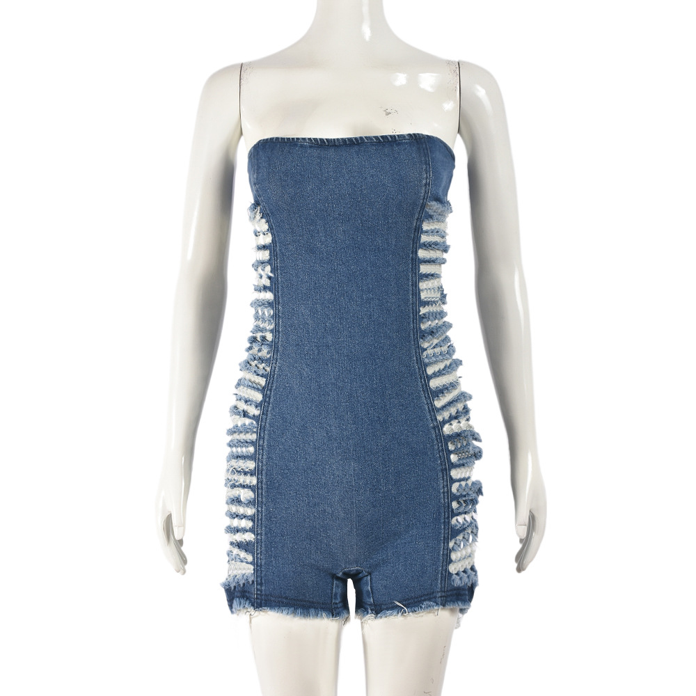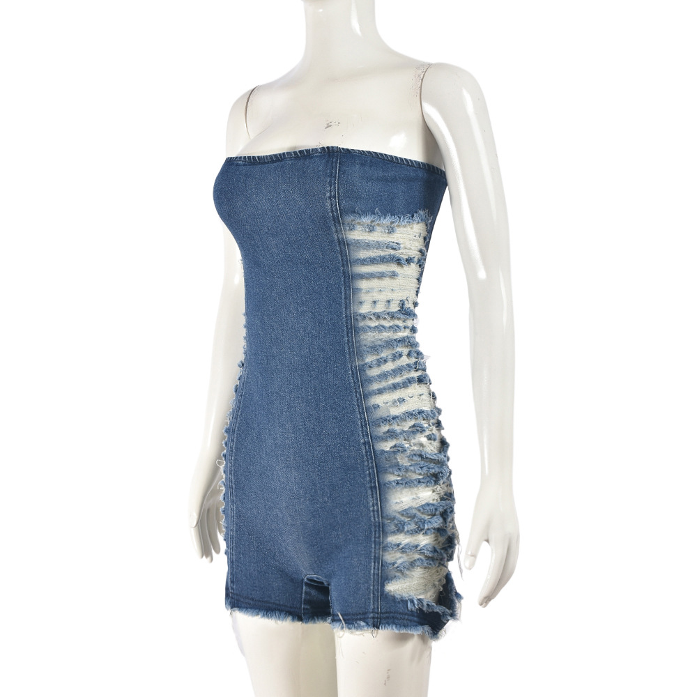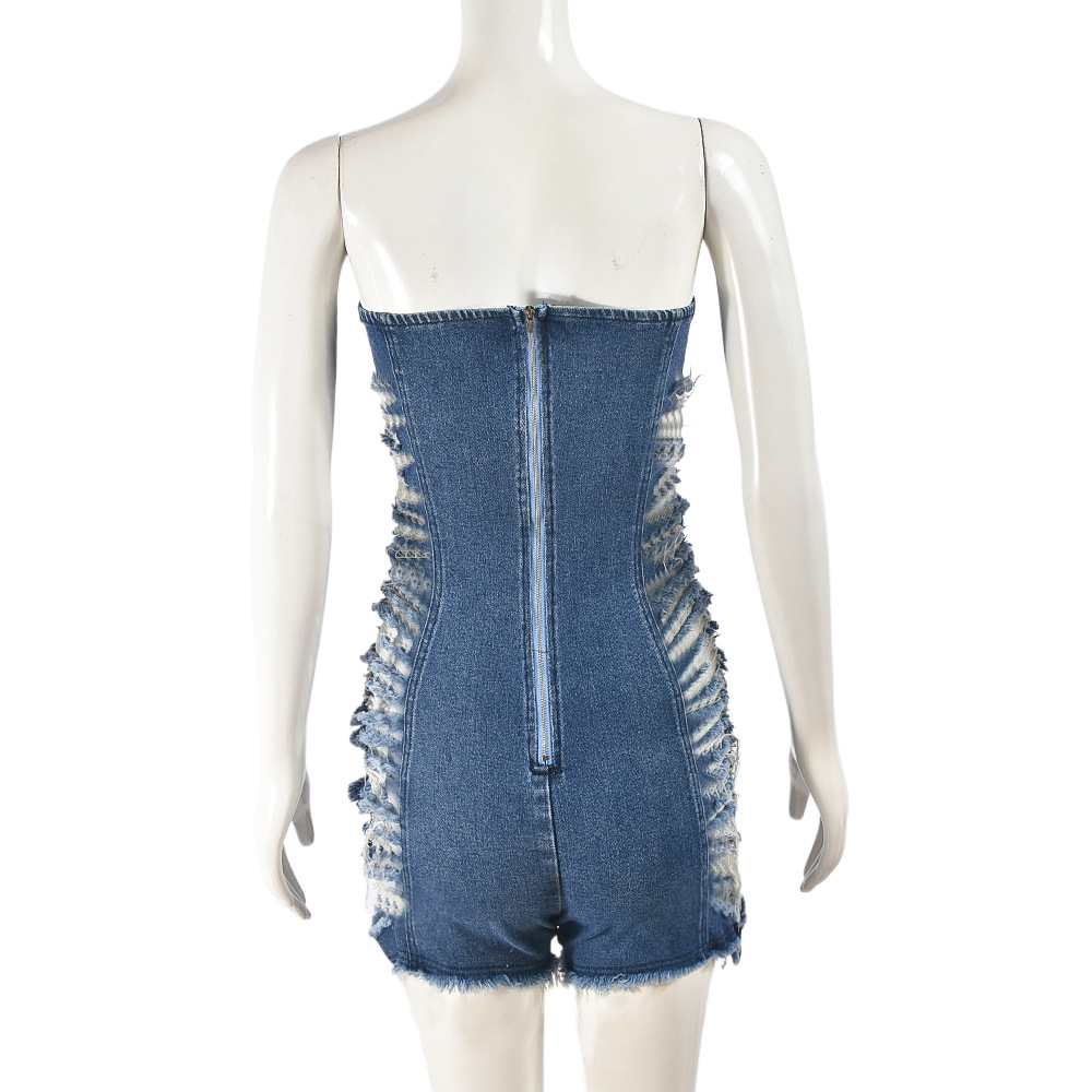 Sexy Cutout Hole Zipper Corset Stretch Denim Wash Jumpsuit