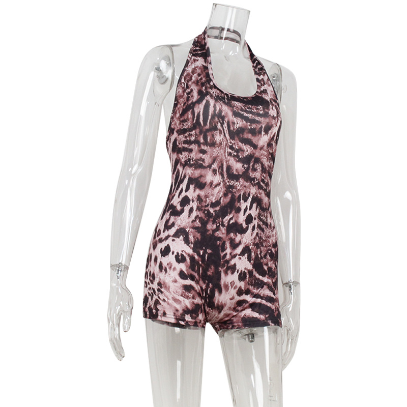 Sexy Low Cut U Collar Halter Backless Sexy Leopard Print Tight Fitting Cinched Shaping Jumpsuit Shorts Women