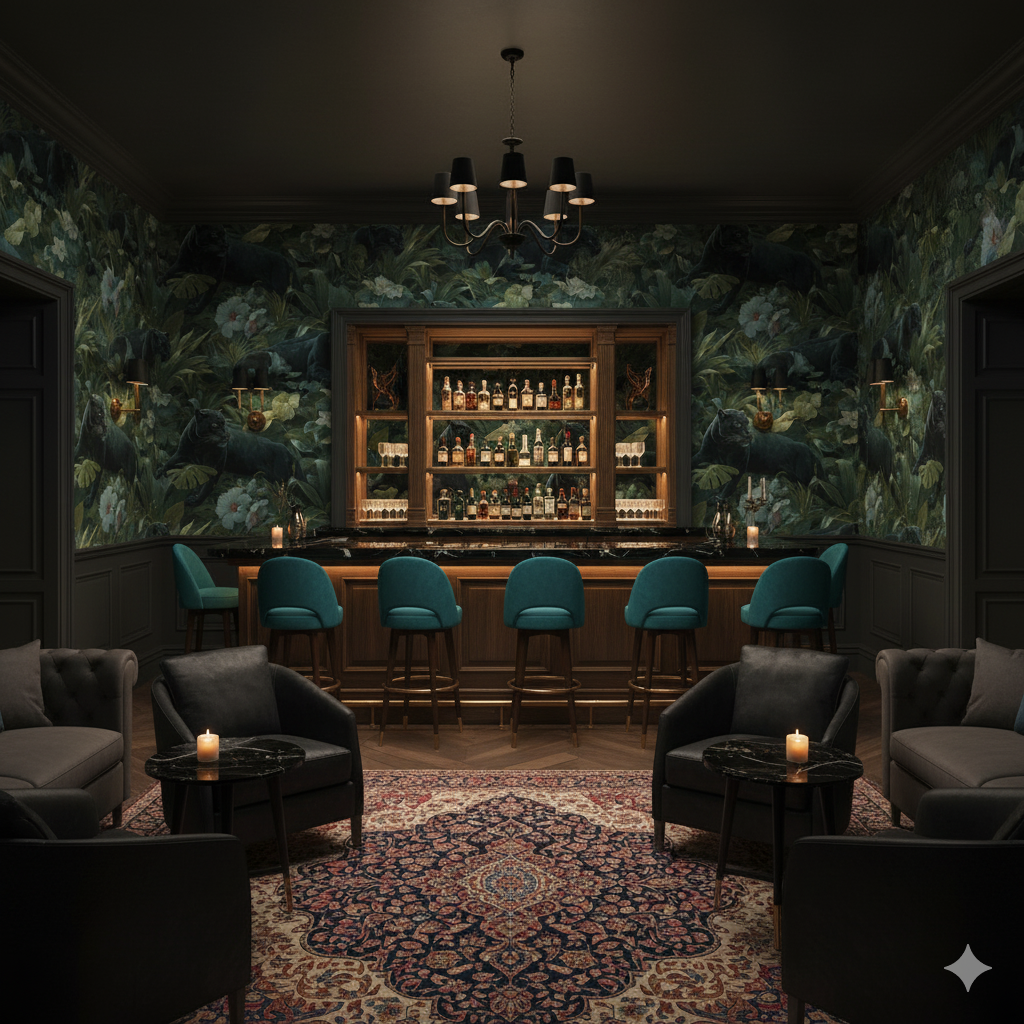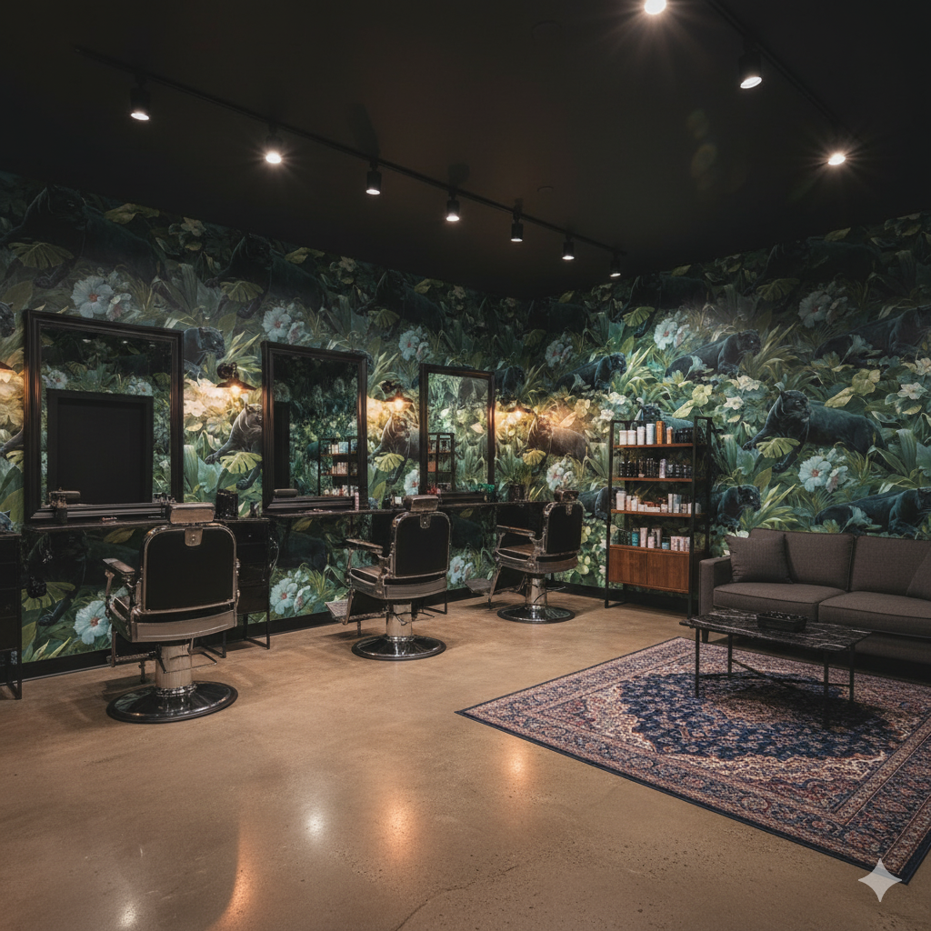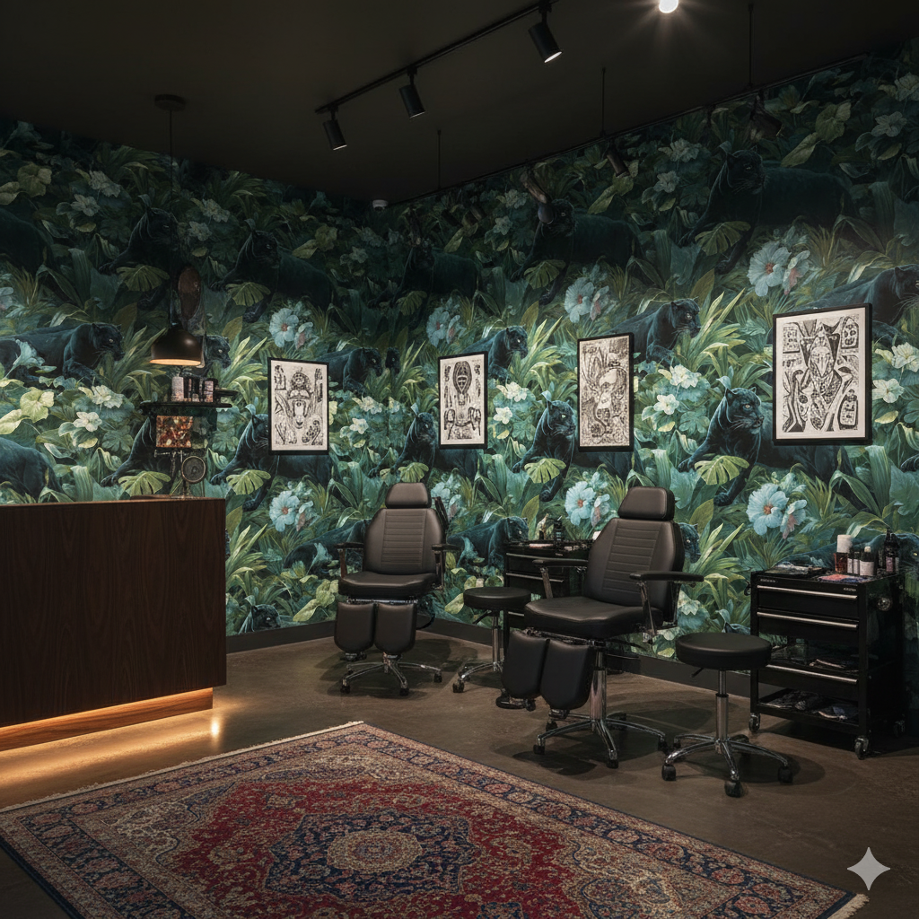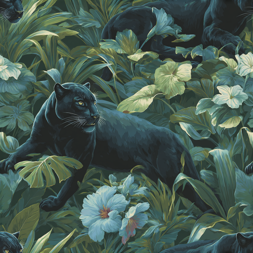 "Shadowstalk" captures the stealth and elegance of black panthers prowling beneath moonlit jungle foliage. With a rich palette of deep indigos, emeralds, and silvery moonlight highlights, this wallpaper exudes mystery and allure. Subtle floral elements peek through the foliage, adding softness to the otherwise bold design. Perfect for dramatic living rooms, upscale lounges, or statement stairwells.