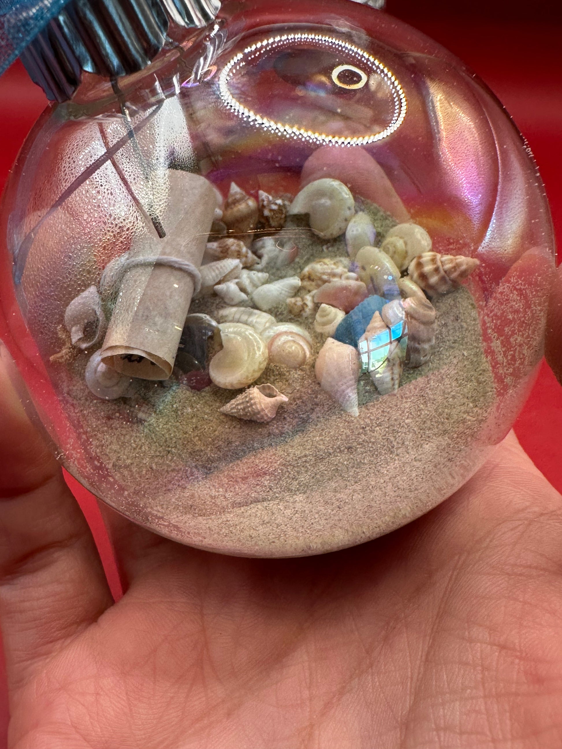 Bring a touch of the beach to your holiday décor with our Shell In Your Pocket Ornament. Each glass globe holds real sand, tiny seashells, and a miniature “message in a bottle” that reads: “May you always have a shell in your pocket and sand between your toes.”