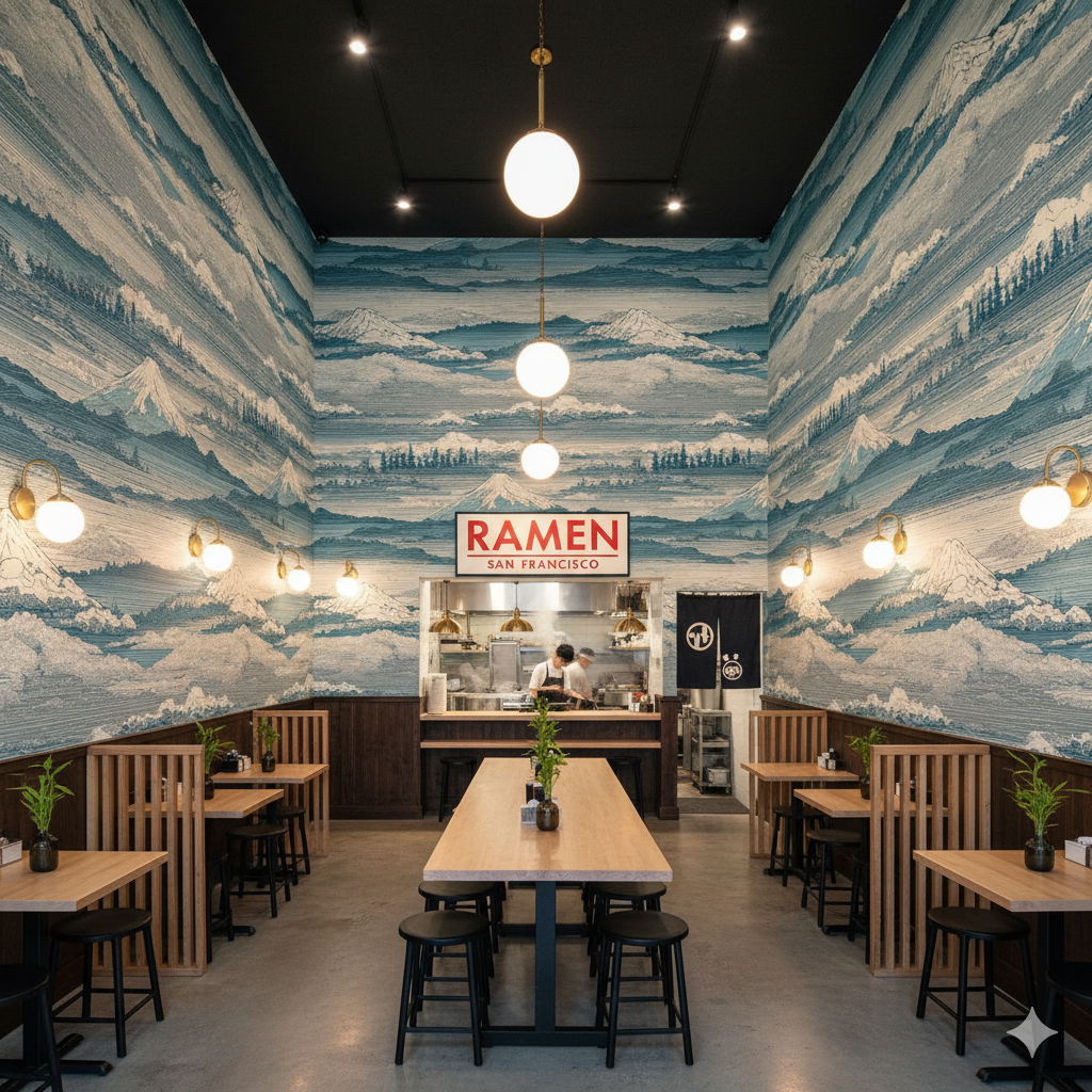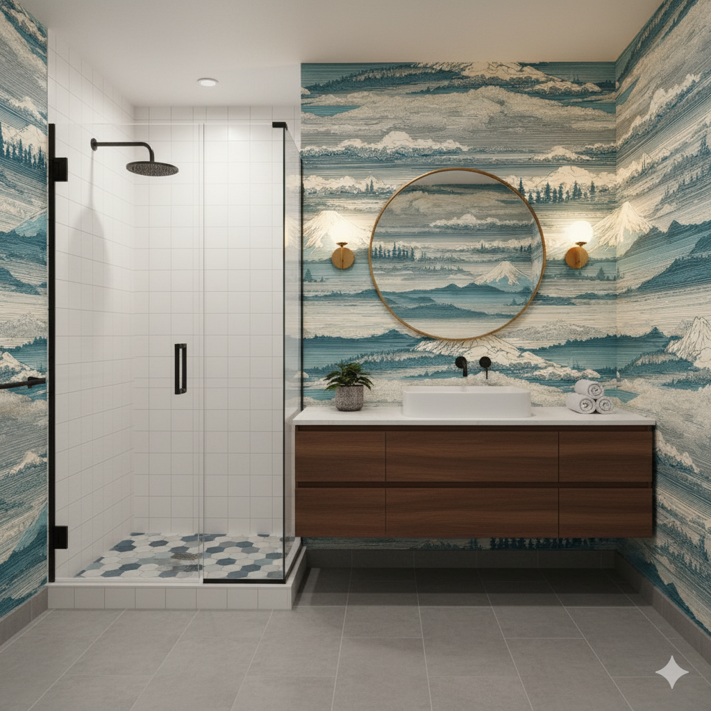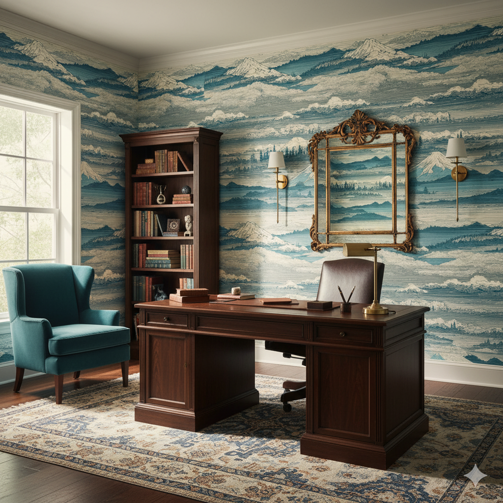 Expansive mountain ranges and drifting clouds rendered in ukiyo-e linework stretch across the walls, immersing the viewer in a panoramic landscape. Deep indigos, pale aquas, and subtle grays create a layered effect, suggesting both depth and tranquility. This wallpaper captures the meditative quality of traditional Japanese woodblock prints, making it ideal for spaces that prize calm and reflection. It’s stunning in living rooms, tea rooms, or creative studios, where the scenic breadth elongates walls and transforms interiors into immersive vistas. The design lends an architectural quality, as though walls themselves open into painted horizons.