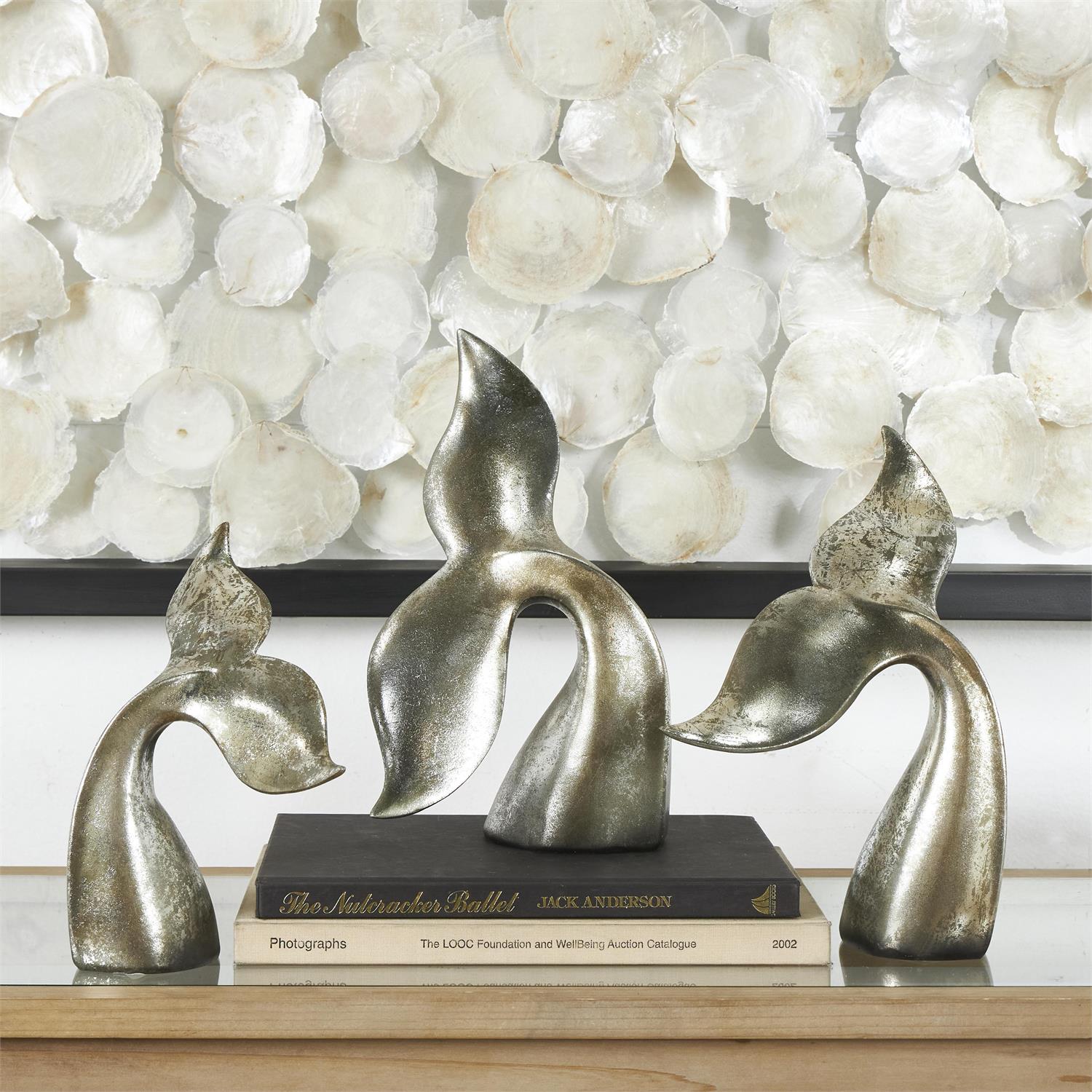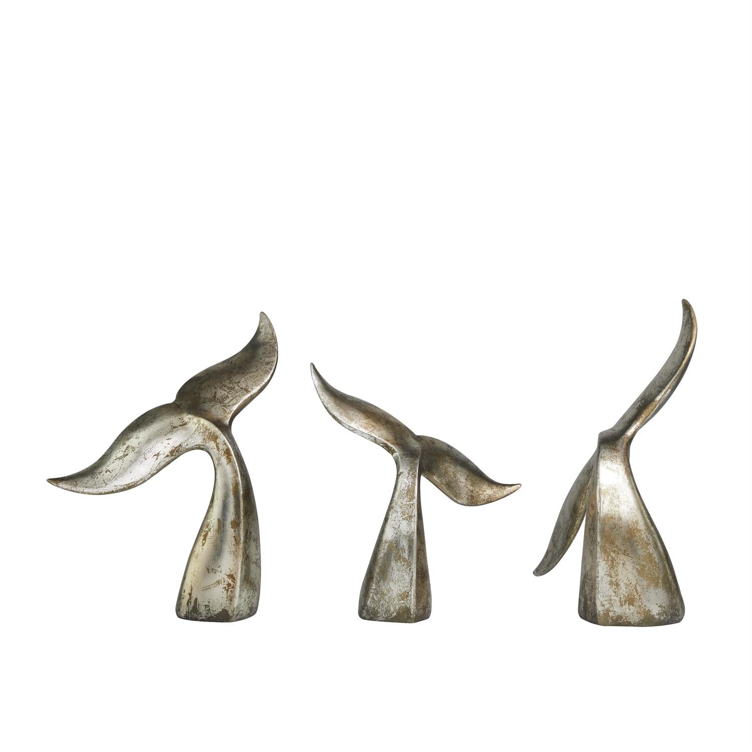 Bring the majesty of the ocean into your home with this elegant silver whale tail sculptures. Crafted from durable polystone, each piece features a weathered silver finish with copper distressing, evoking a sense of timeless coastal charm. The various-sized whale tails create a dynamic marine-themed display, perfect for ocean lovers and coastal-inspired decor.