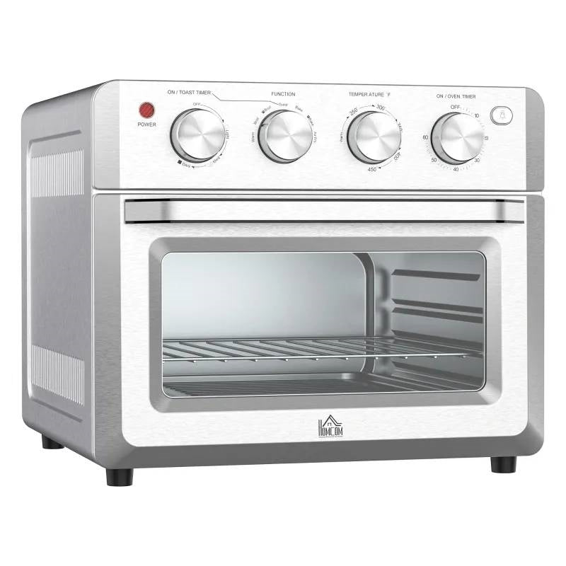 This Silver Multi-Function 7-in-1 Toaster Oven 21 QT features 7 functions - warm, broil, convection broil, toast, bake, convection bake and air fryer to meet your daily cooking needs. You can easily control the temperature of this conventional oven from 100 F - 450 F and cooking time from 0-60 minutes according to your needs. 3 toasted shade options in light, medium and dark can be selected by switching the toaster timer button. The built in light and glass viewing window allow you to observe the process and 3 rack positions let you cook different kinds of food at once in this convection oven. This 4 slice toaster oven provides ample room for 4 slices of bread or up to a 9"pizza while saving space in your kitchen. Feature 1 x fry basket, 1 x oven rack, 1 x baking pan, and 1 x crumb tray to make different delicious food