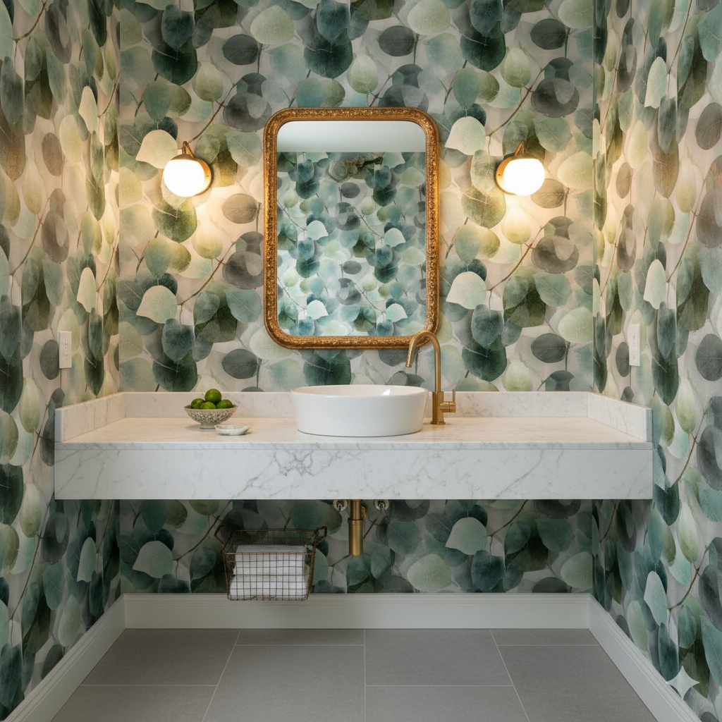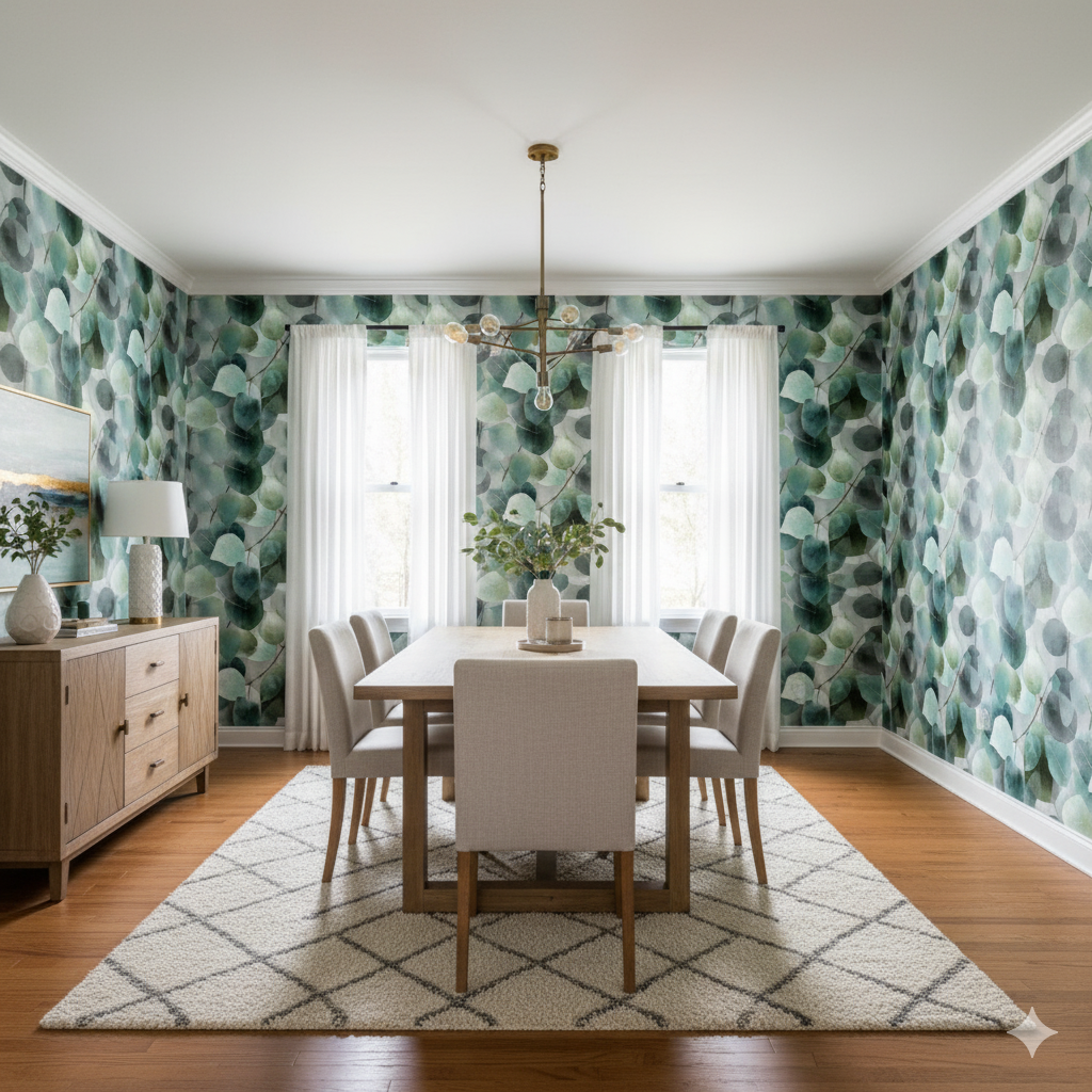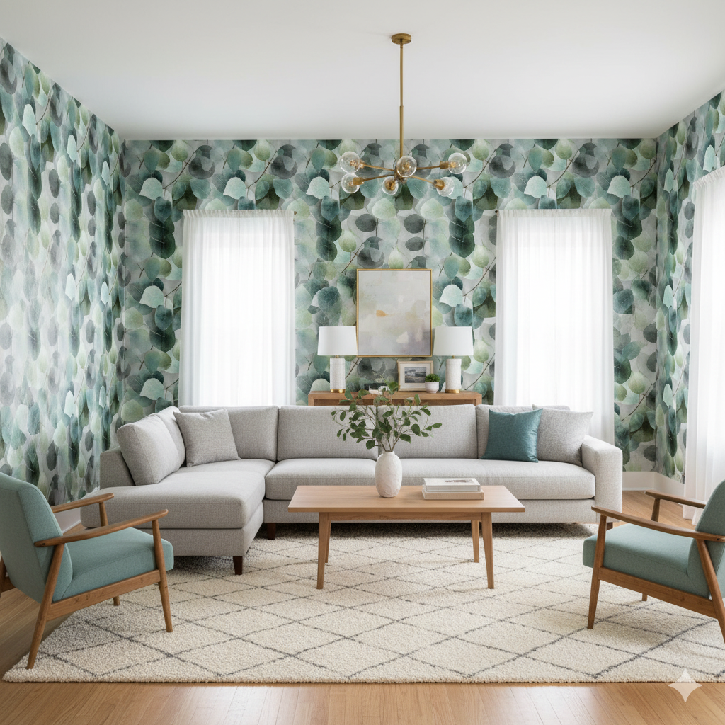 Soft, overlapping eucalyptus leaves in shifting tones of sage, aqua, gray, and charcoal cascade like layers of translucent watercolor washes. Their delicate veins and subtle gradients create depth without heaviness, allowing Silverwood to carry a light, floating quality across walls. This design is perfect for bedrooms, nurseries, or spa-inspired bathrooms where serenity is the goal. It feels fresh, organic, and timeless — working seamlessly with Scandinavian minimalism, California casual interiors, or farmhouse-modern palettes. A pattern that gently breathes life into walls without overwhelming them.