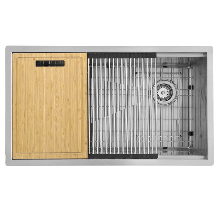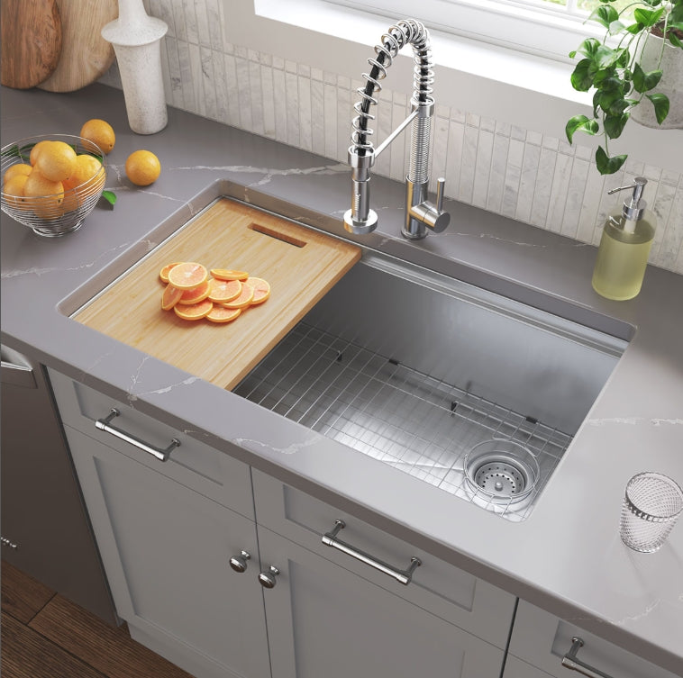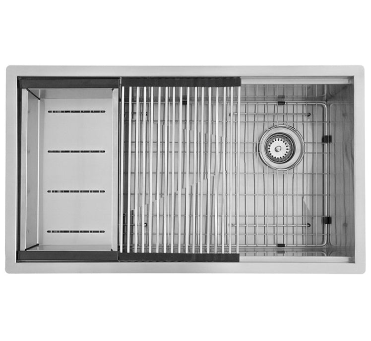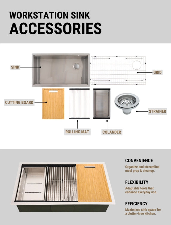 Upgrade your kitchen with this handcrafted undermount Workstation Sink, designed in a 33" x 19" x 10" size and made from robust 16-gauge stainless steel with a sophisticated satin finish. The sink features a fully undercoated interior for enhanced sound absorption and includes a suite of practical accessories: a cutting board, colander, rolling mat, grid, and strainer. Each component can be used individually or together, offering maximum flexibility and functionality in your culinary space.