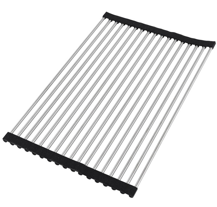 - Sink features single basin with cutting board, colander, rolling mat, grid, and strainer