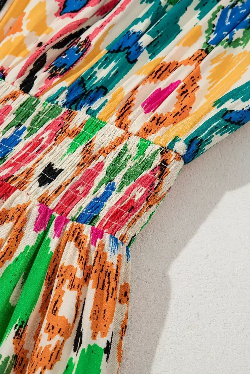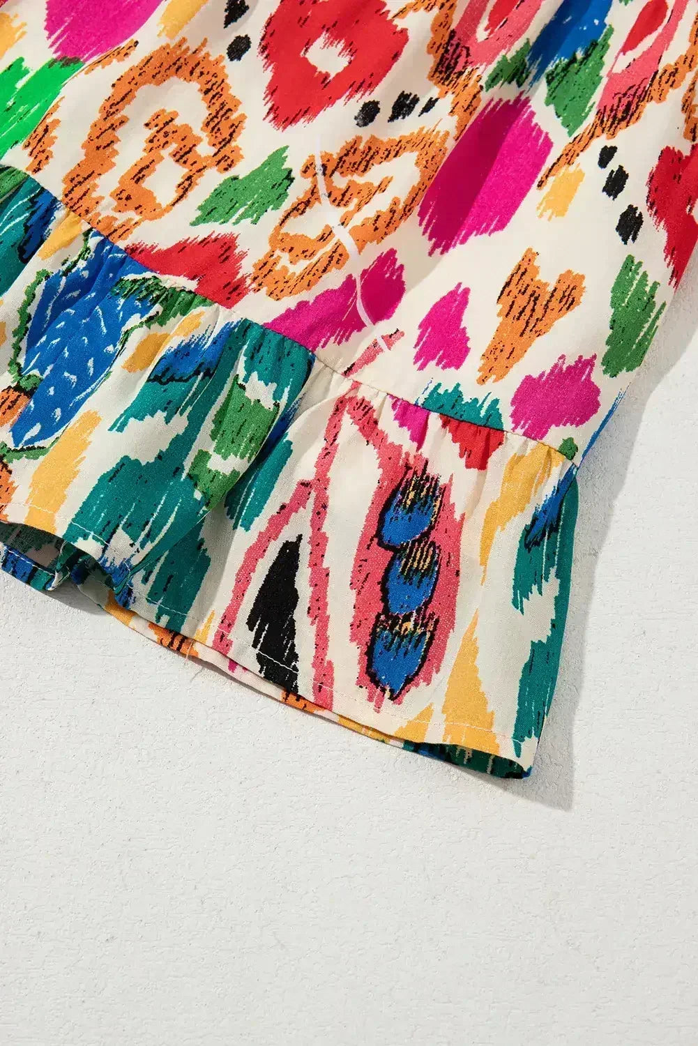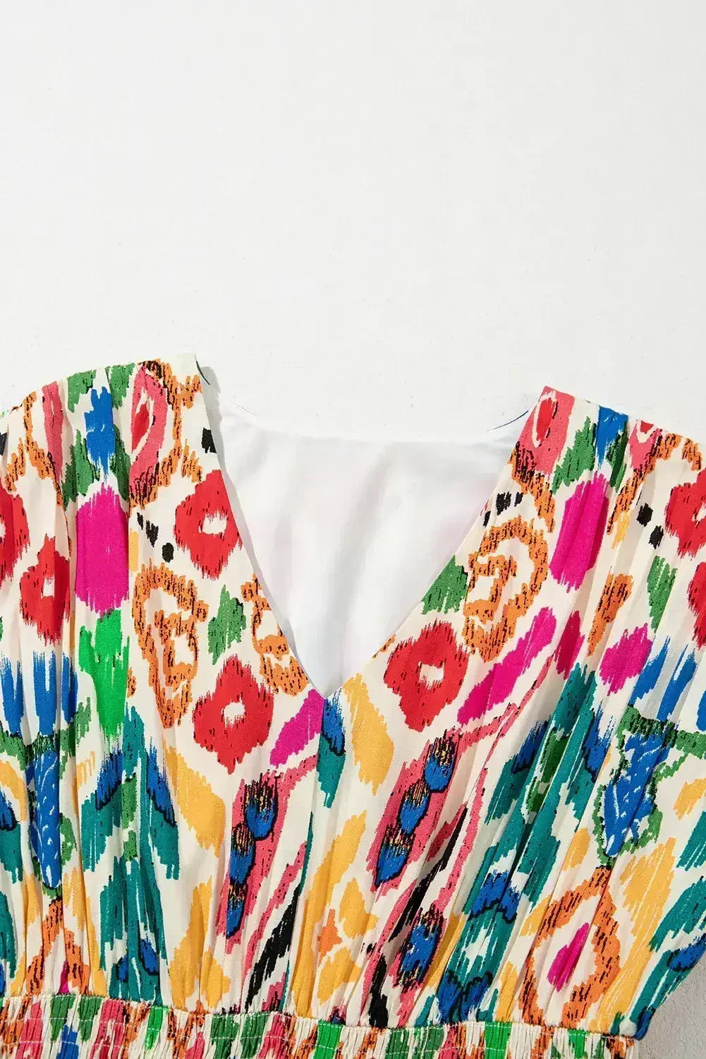 Sky Blue Abstract Print V Neck Dolman Sleeve Ruffle Tiered Mini Dress