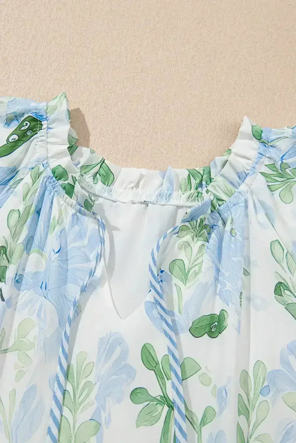 Sky Blue Floral Contrast Edge Ruffle Sleeve Tie Neck Mini Dress