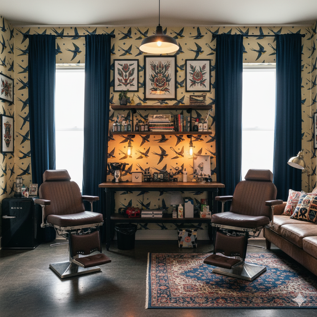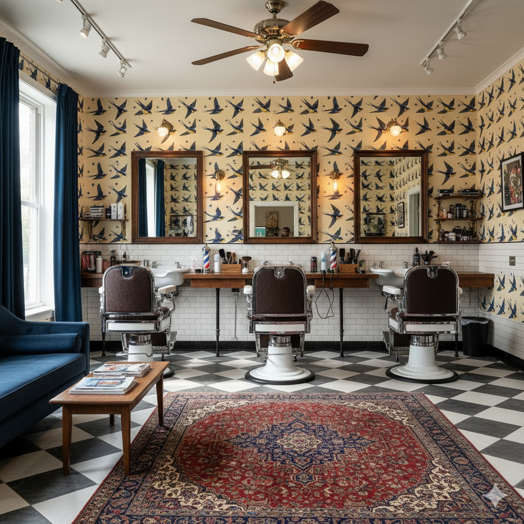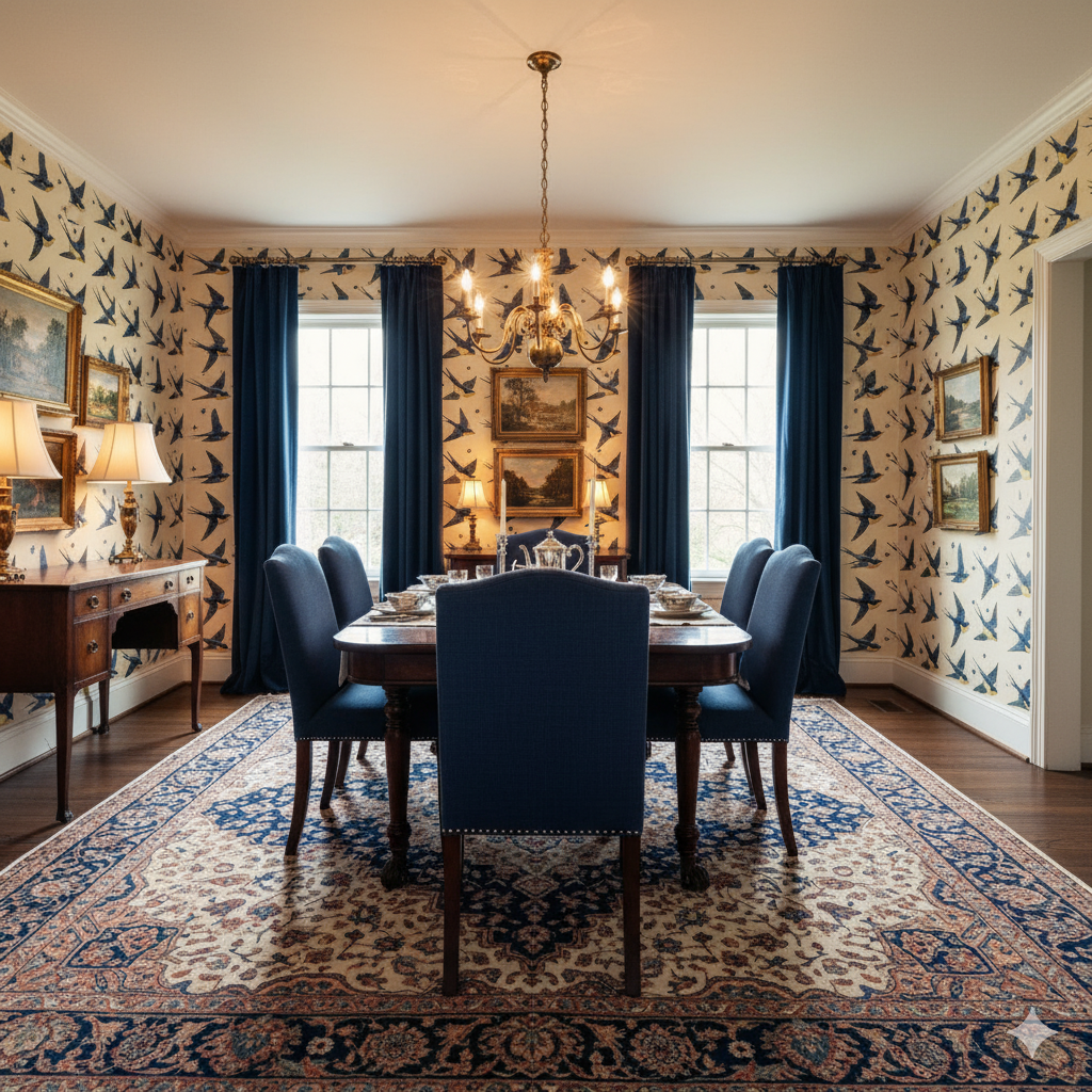 Sleek swallows swoop gracefully across a pale golden ground, their blue wings spread wide as stars punctuate their flight. The repetition and rhythm of the birds give the design both energy and harmony, while the vintage rendering recalls early 20th-century textiles. Skyward Song brings a lighthearted freedom to interiors, making it a perfect fit for nurseries, hallways, or seaside cottages. It pairs beautifully with whitewashed woods, indigo textiles, and spaces that benefit from a balance of charm and motion.