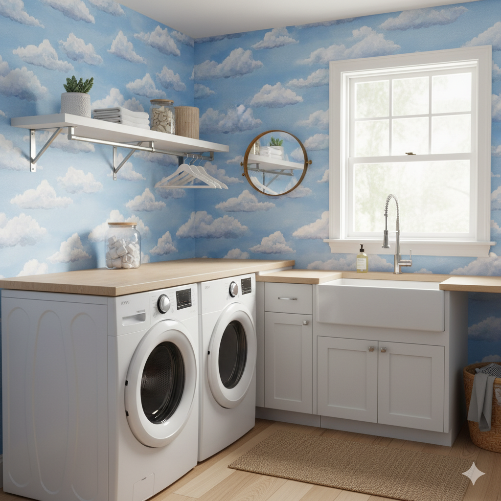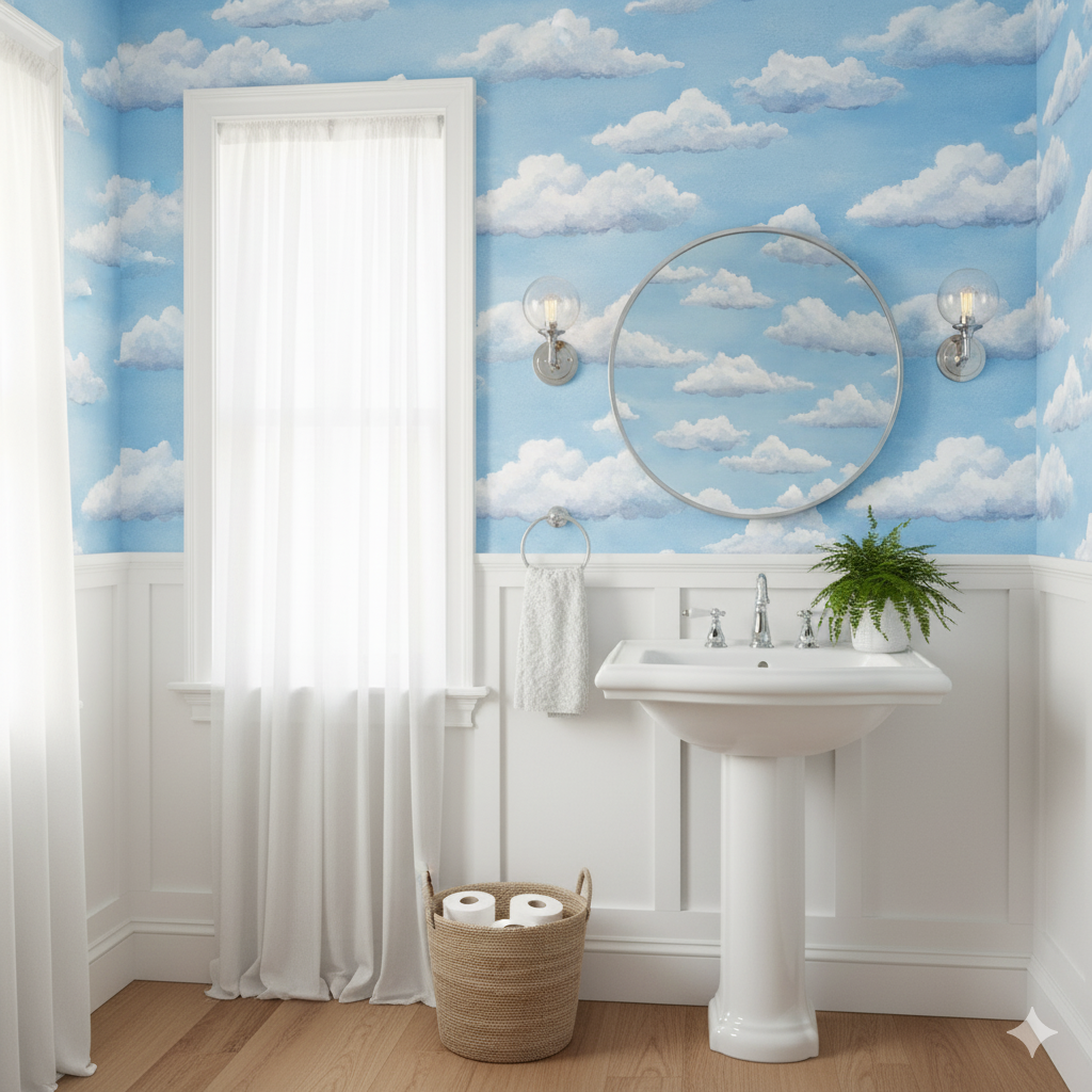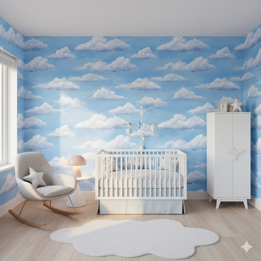 This design captures the playful serenity of a wide-open sky dotted with soft watercolor clouds. Gentle brushstrokes render the clouds with a dreamy mix of whites and grays, floating effortlessly against a vivid blue backdrop. It has a nostalgic, storybook-like charm, evoking childhood memories of laying in the grass and searching for shapes in the sky. This wallpaper is versatile enough for nurseries, playrooms, or airy living spaces, where it adds a sense of openness and tranquility. Its whimsical tone balances both sophistication and innocence, making it equally fitting for cozy family homes and boutique cafés aiming for a lighthearted aesthetic.