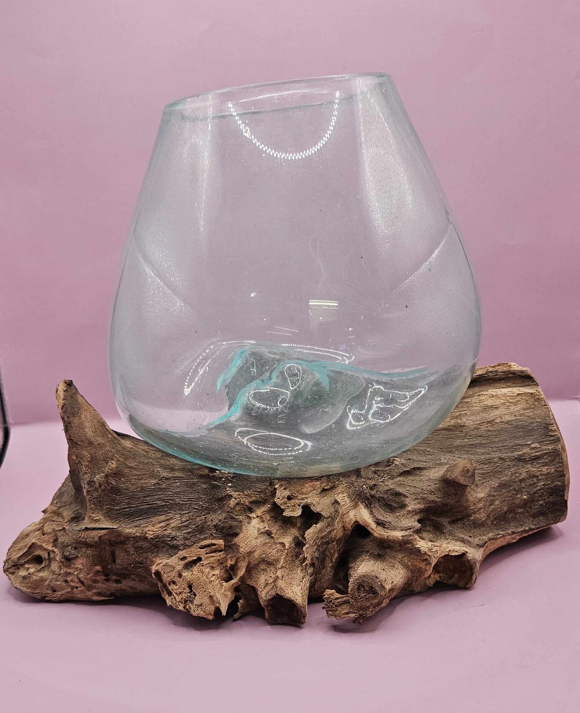 Infuse your space with natural elegance and artistic charm with our Teak Wood and Molten Glass Terrarium. Each piece is a stunning creation where molten glass is carefully hand-shaped over a natural teak wood base, resulting in a captivating, one-of-a-kind decor element.