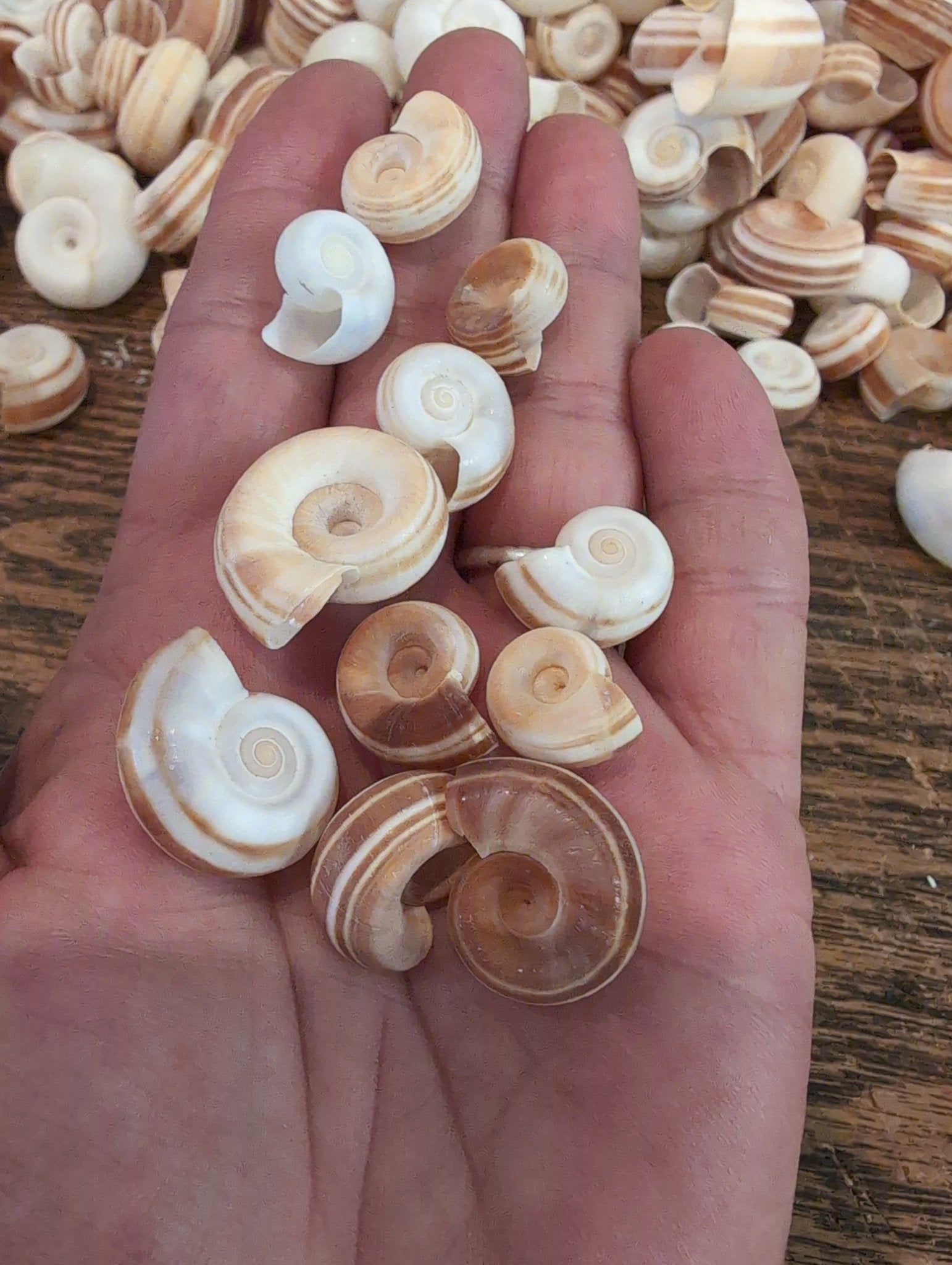 White & Brown Ram Horn Snail Shells, some are all white, others have brown stripe. These are perfect add to shadowbox curiosities or to use in unique jewelry designs. These are known as Marisa Cornuarietis- which are freshwater gastropods.