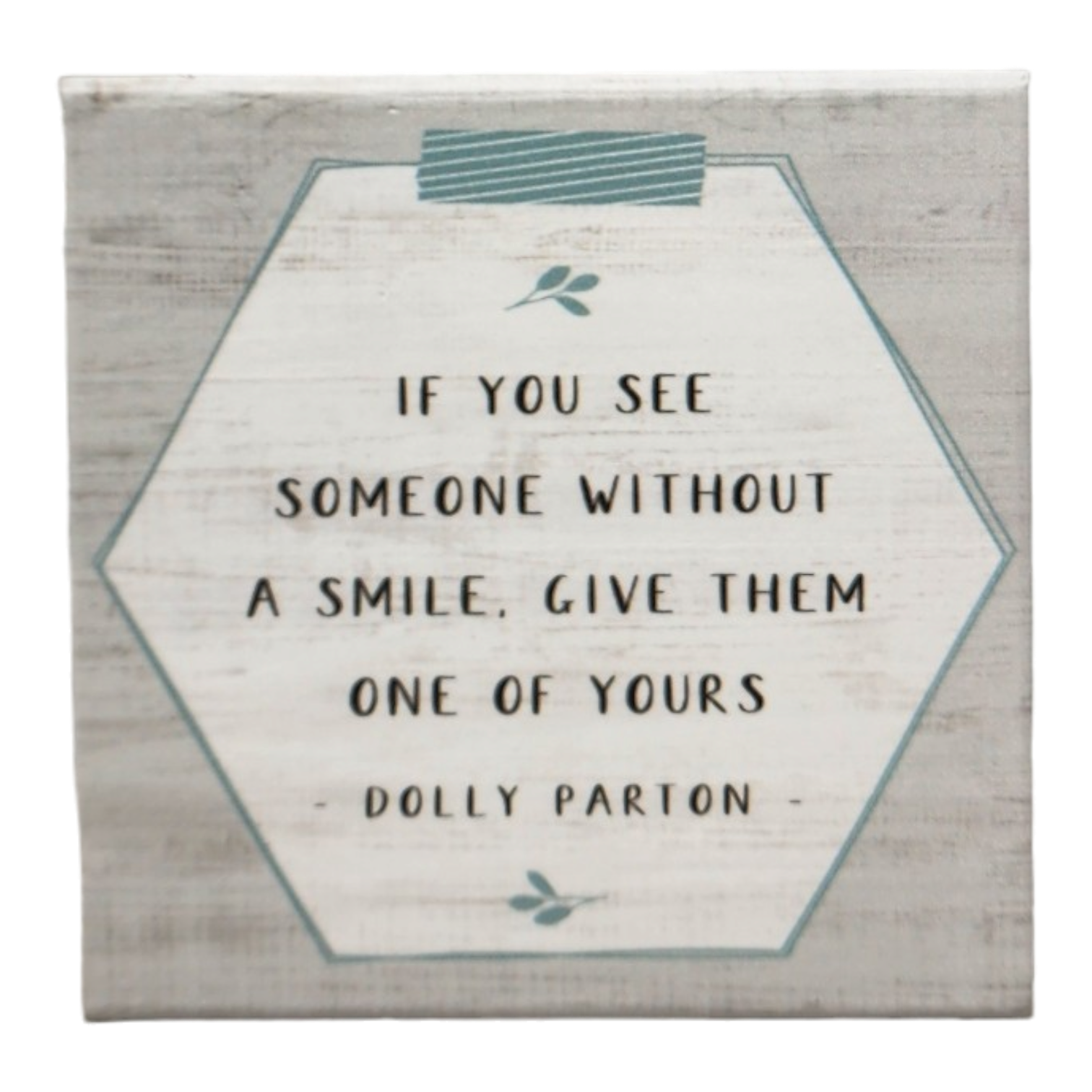 Brighten up any space with the heartfelt sentiment from Dolly Parton: "If You See Someone Without A Smile, Give Them One of Yours." This charming Wooden Shelf Sitter Sign measures just over 5 inches square and 1.25 inches thick, making it a perfect addition to your home decor. Display it on your desk, bookshelf, or kitchen counter to encourage kindness and spread joy wherever you go—because a small act of love can have a big impact!