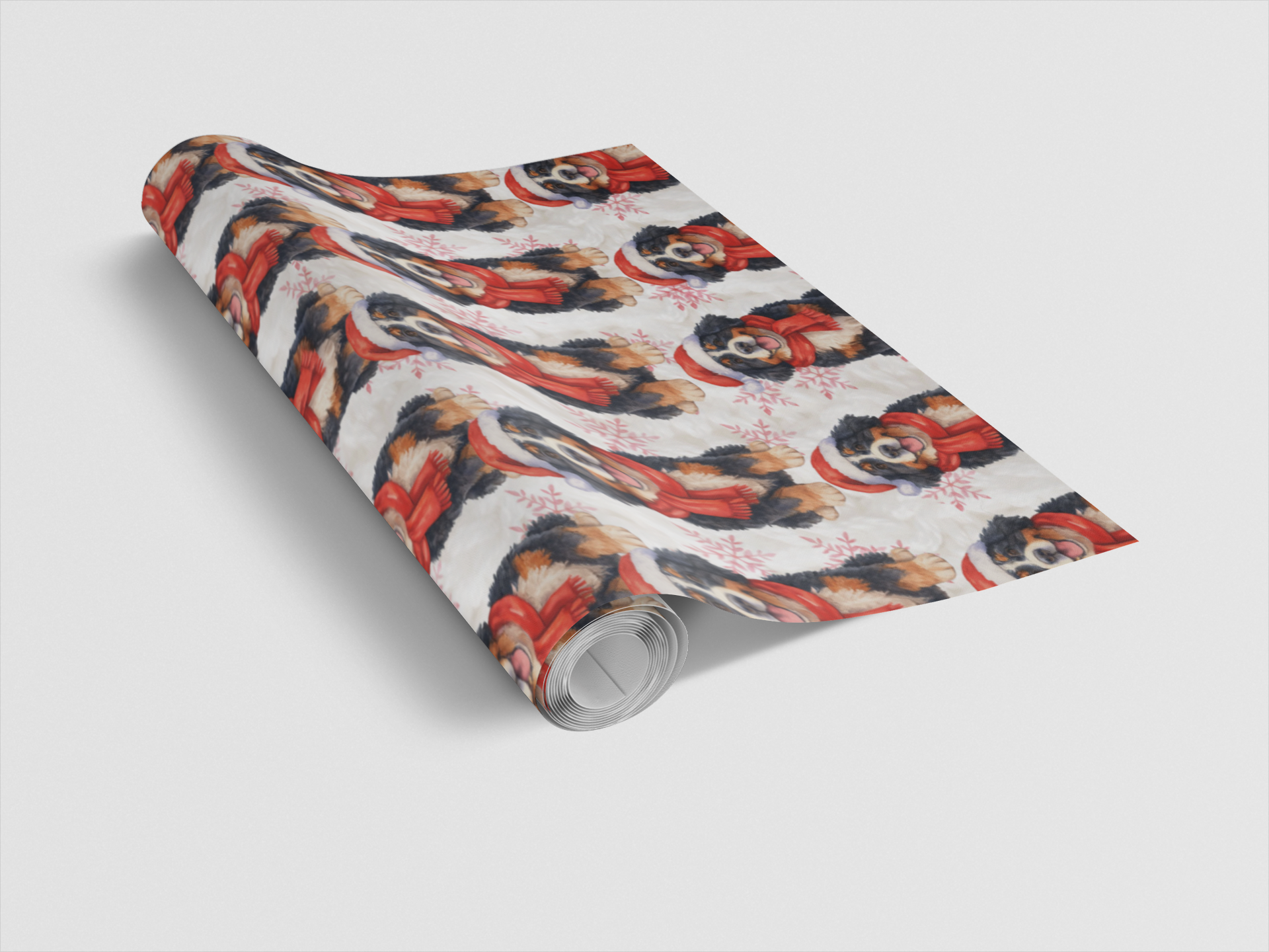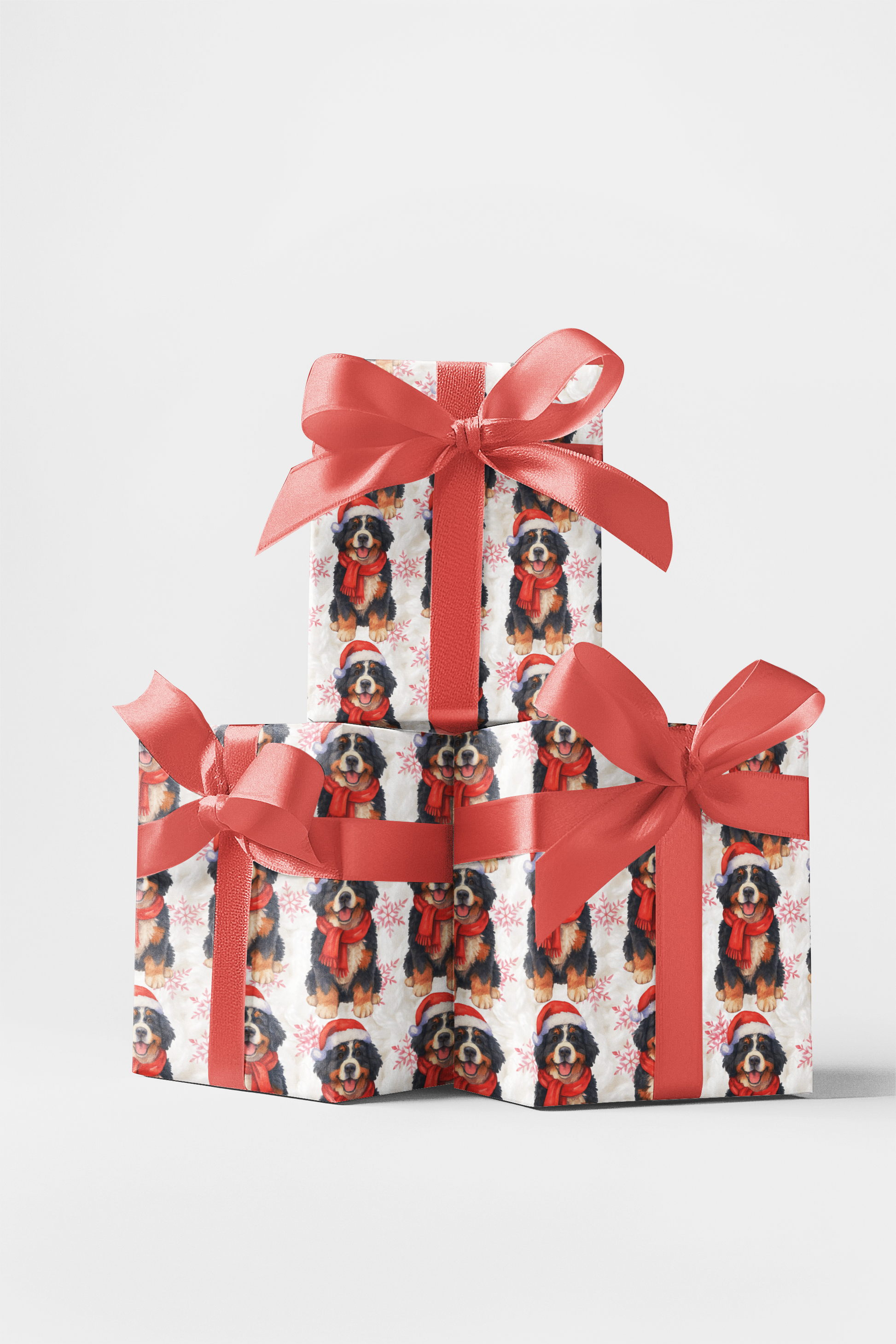Snowflakes & Scarlet Whimsy (Bernedoodle) With a hat as red as winter berries and a scarf snug against the chill, the Bernedoodle brings playful warmth to the holiday season. This Christmas wrap captures their cheerful spirit amid drifting snowflakes and frosty air. Every fold is a celebration of cuddly charm, joyful hearts, and the cozy magic only this lovable companion can bring to festive days.