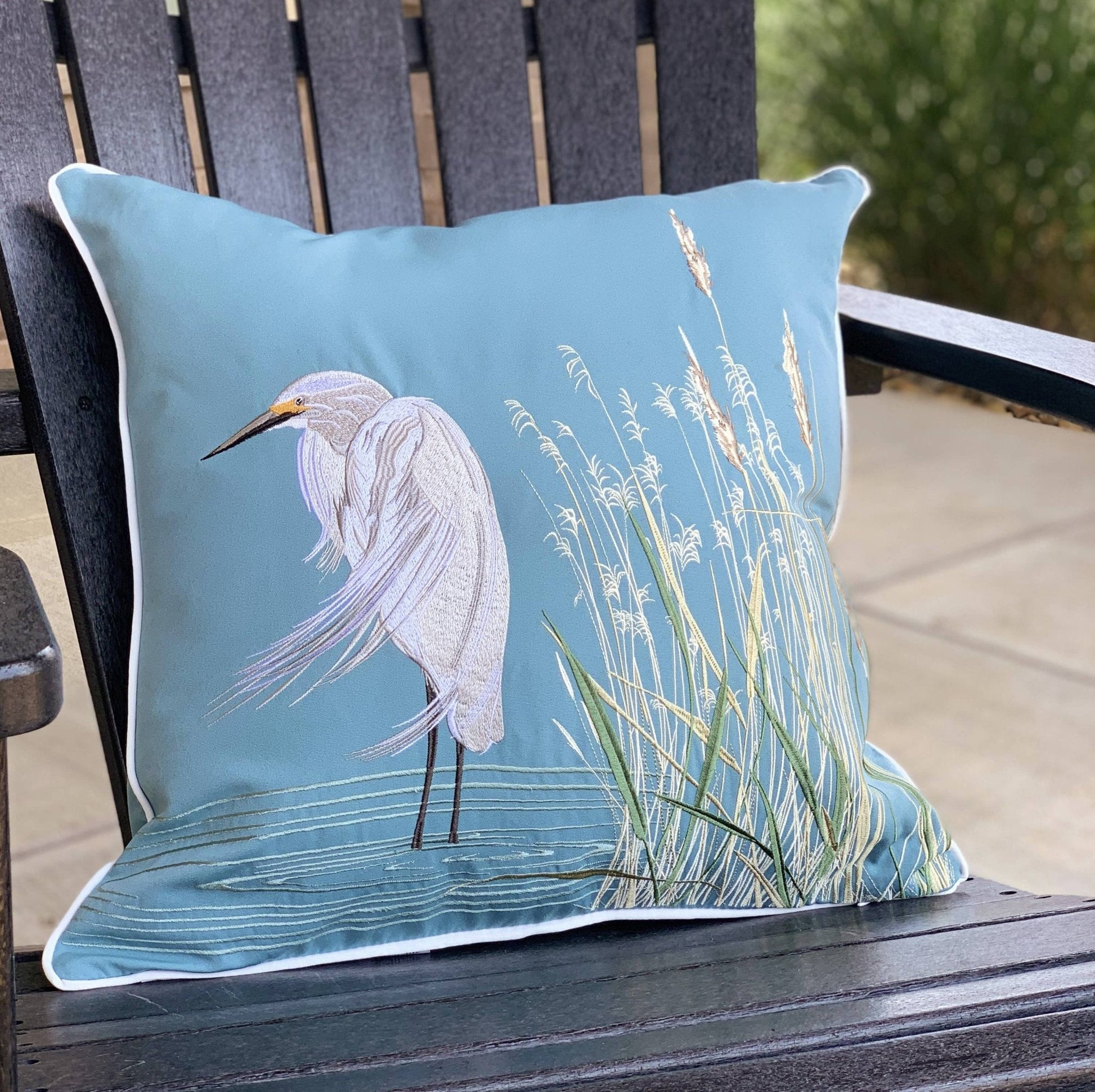 Inspired by the graceful beauty of the snowy white egret, this embroidered Snowy White Egret Pillow captures the serene elegance of this majestic bird as it stands among coastal reeds. Featuring multi-white, grey, and green embroidery atop a spa-like Oceana blue background, this refined coastal design is finished with crisp white piping, making it a sophisticated yet natural accent for any space.