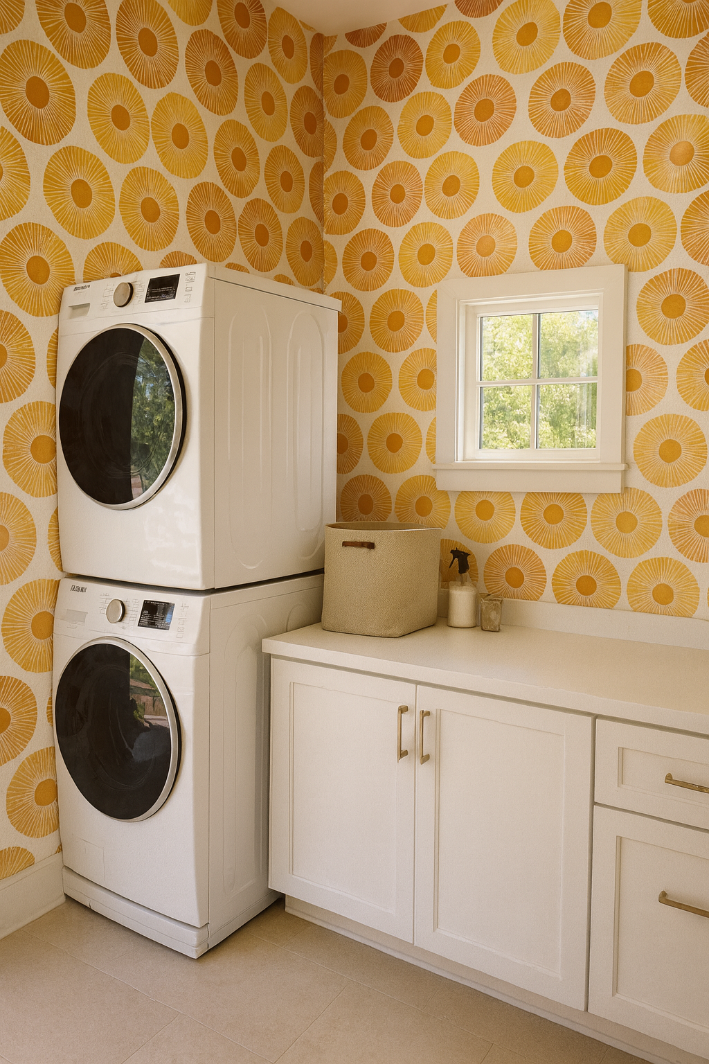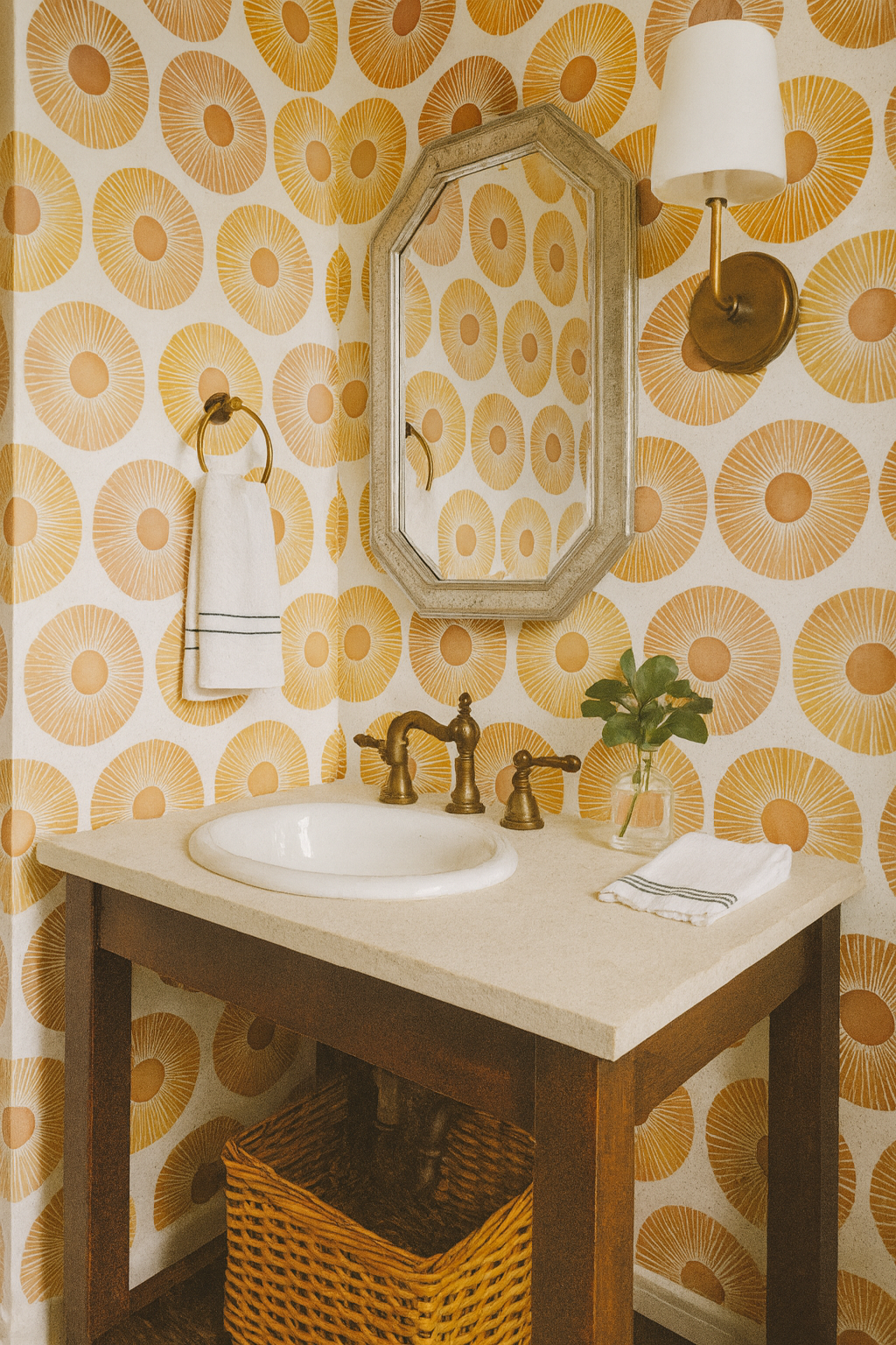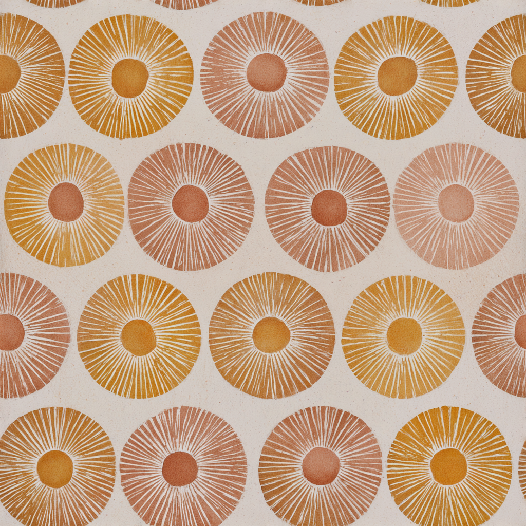 Radiating retro warmth, Solar Sweets features concentric circular motifs reminiscent of sunbursts, candies, or even mid-century vinyl records. Stamped in ochre, burnt sienna, rust, and gold on a subtly textured cream base, the design repeats with rhythmic energy. Perfect for a sunny kitchen, a retro-inspired dining room, or a bohemian cafe interior.