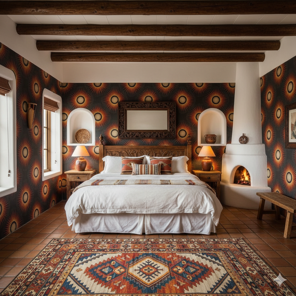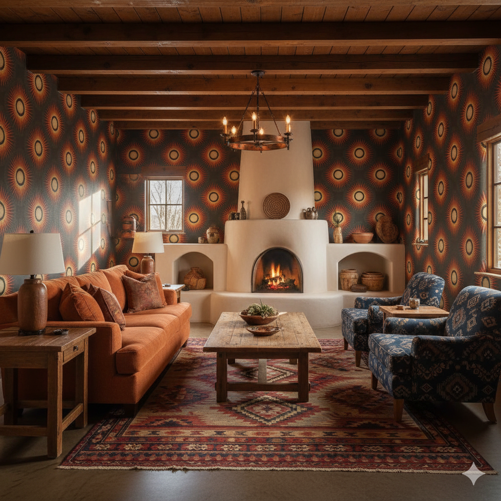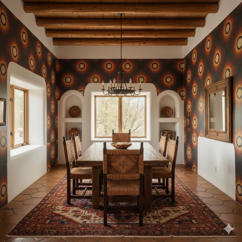 Radiating medallions blaze outward in fiery tones of red, orange, and gold, each one resembling the brilliant corona of a sun caught mid-flare. The repeating geometry feels tribal yet regal, balancing primal heat with structured repetition. Against a rich charcoal backdrop, the bursts of color glow like embers in perpetual motion, commanding attention without veering into chaos. This pattern brings undeniable energy to dining rooms, lounges, or eclectic interiors where bold statements are celebrated. Pair it with earth-toned textiles, natural woods, or even sleek modern metals to let the fiery motif take center stage. It’s a design that warms a room both visually and emotionally, perfect for homes that thrive on bold character.