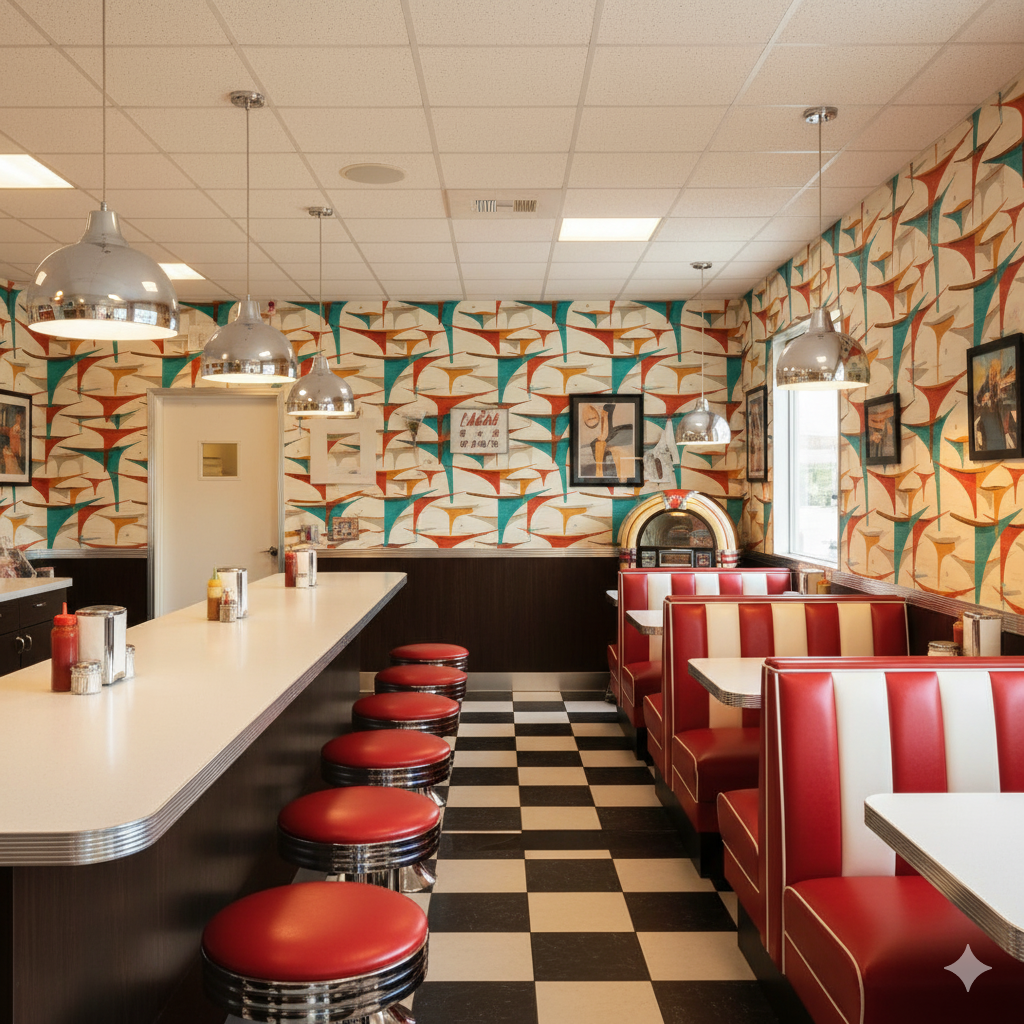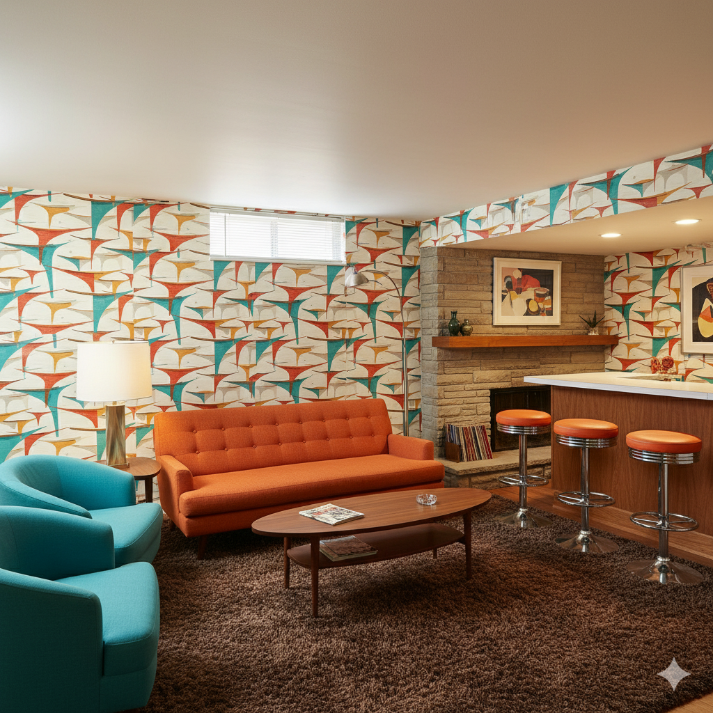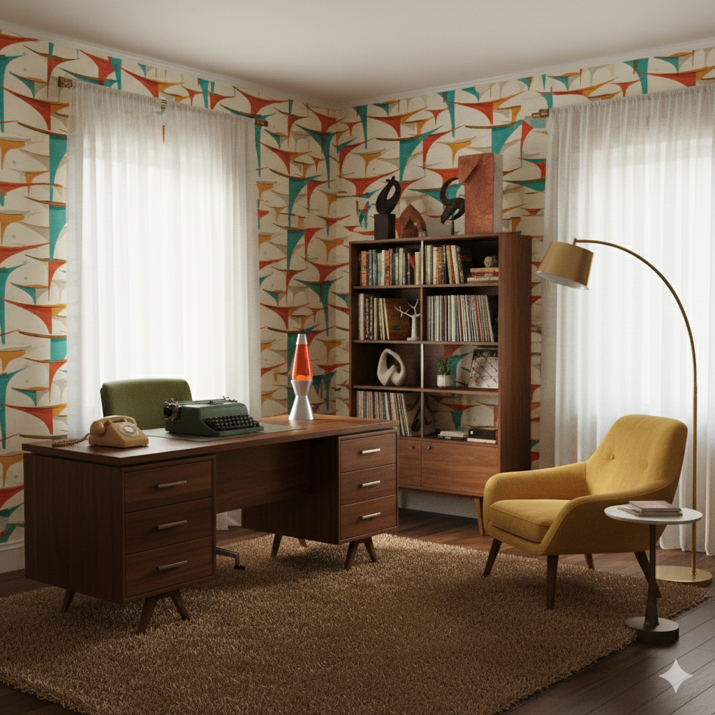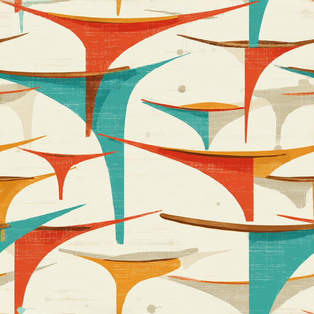 Angular, futuristic swoops of teal, rust, and ochre stretch across a pale backdrop, recalling Googie-era architecture and the imaginative optimism of space-age design. The sharp, boomerang-like arches seem to defy gravity, overlapping like mid-century canopies and signage. Subtle weathering in the print adds a tactile authenticity, as though salvaged from a beloved 1950s roadside motel or coffee shop. This pattern works brilliantly in retro-themed bars, eclectic studios, or accent walls where a conversation piece is welcome. It thrives in company with Formica countertops, starburst clocks, and other classic space-age décor.