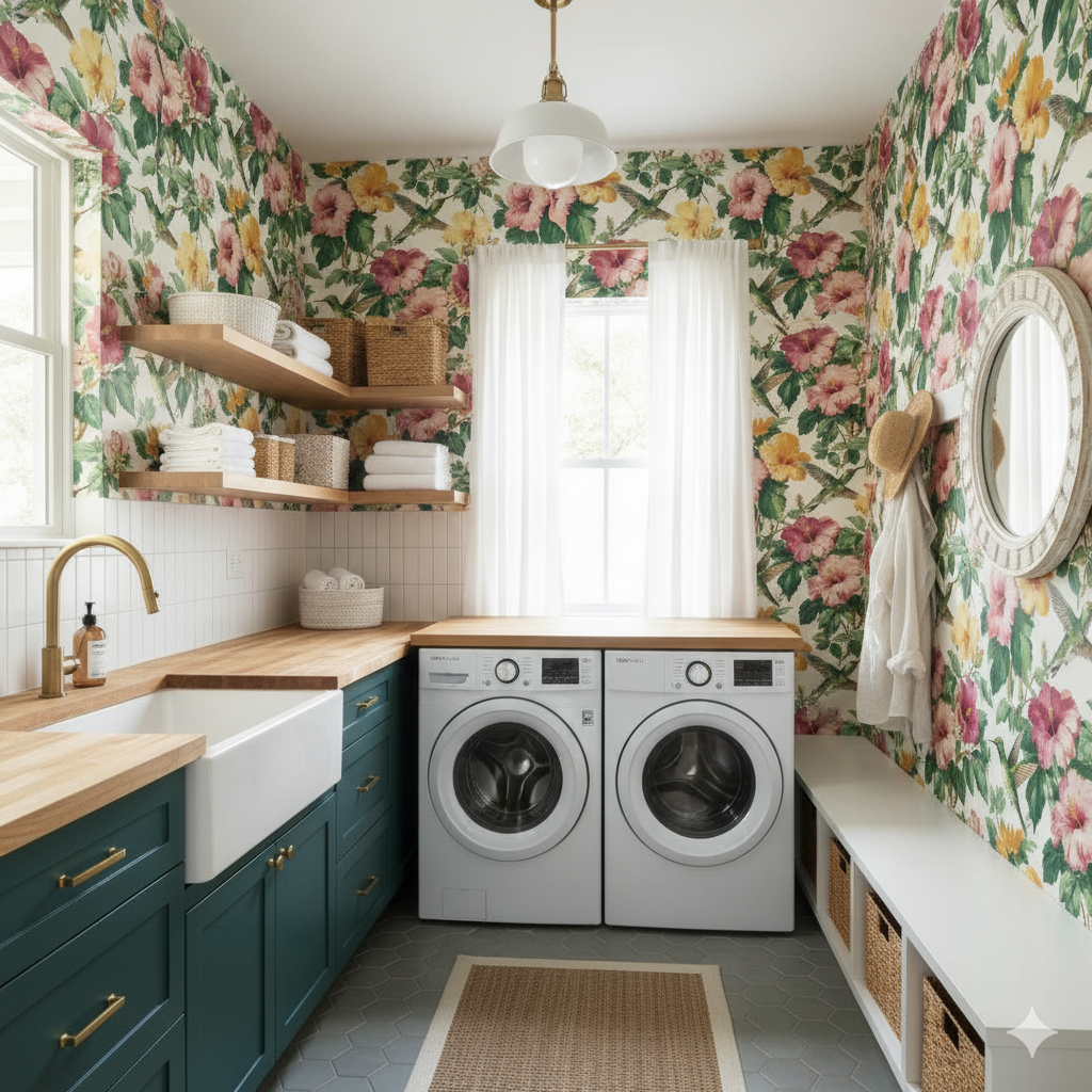 Lush hibiscus blooms in pink, coral, and golden yellow spill across the surface, punctuated by vivid green foliage and darting hummingbirds frozen mid-hover. The tropical palette brims with movement and life, making this design perfect for spaces that want to radiate warmth and energy. Solera Hibiscus is a natural fit for sunrooms, garden-facing living areas, or coastal interiors, bringing an indoor-outdoor continuity. Its bright and celebratory tones also lend themselves well to boutique hospitality spaces, transforming walls into living canvases of summer abundance.