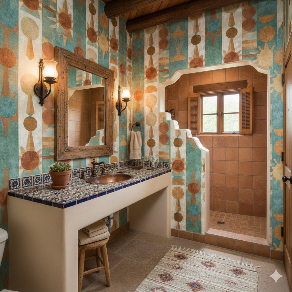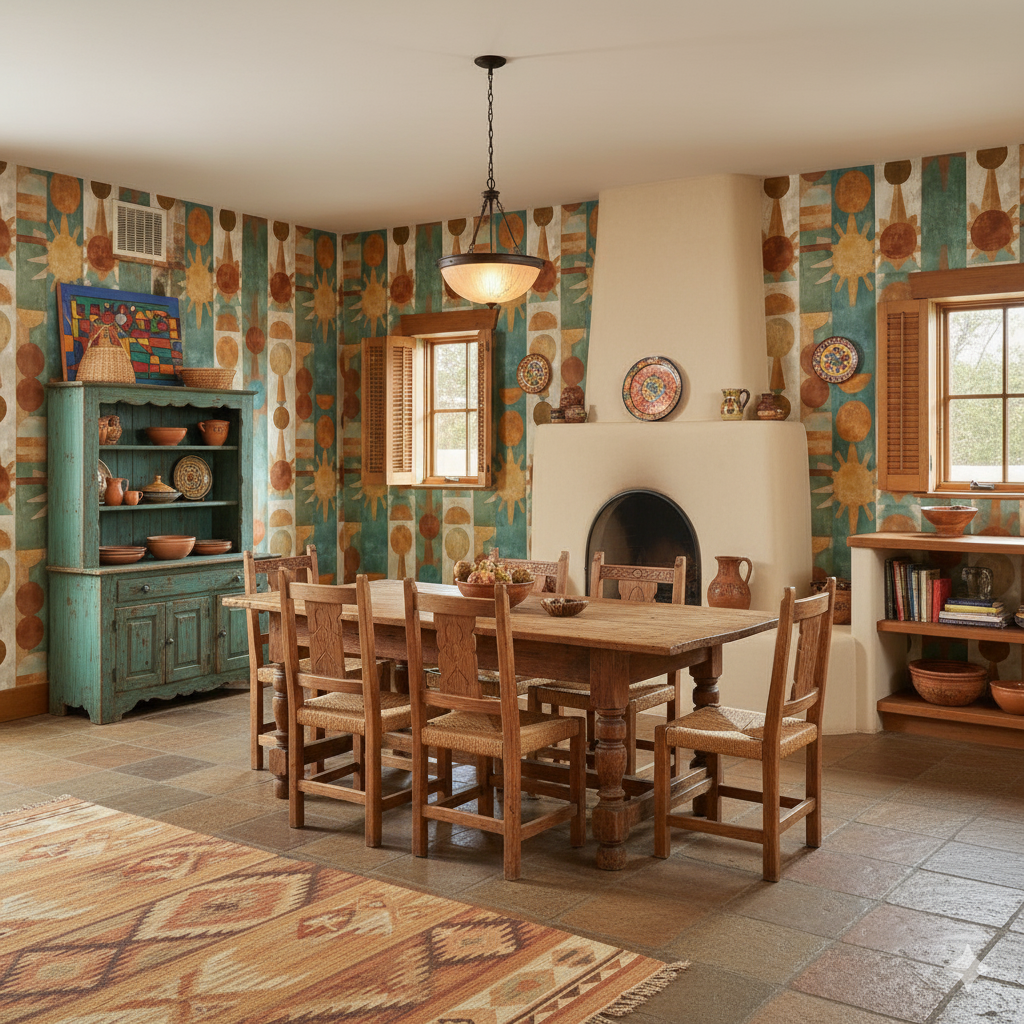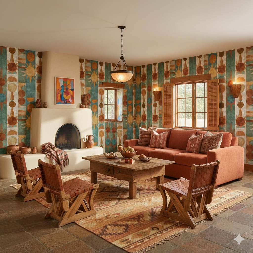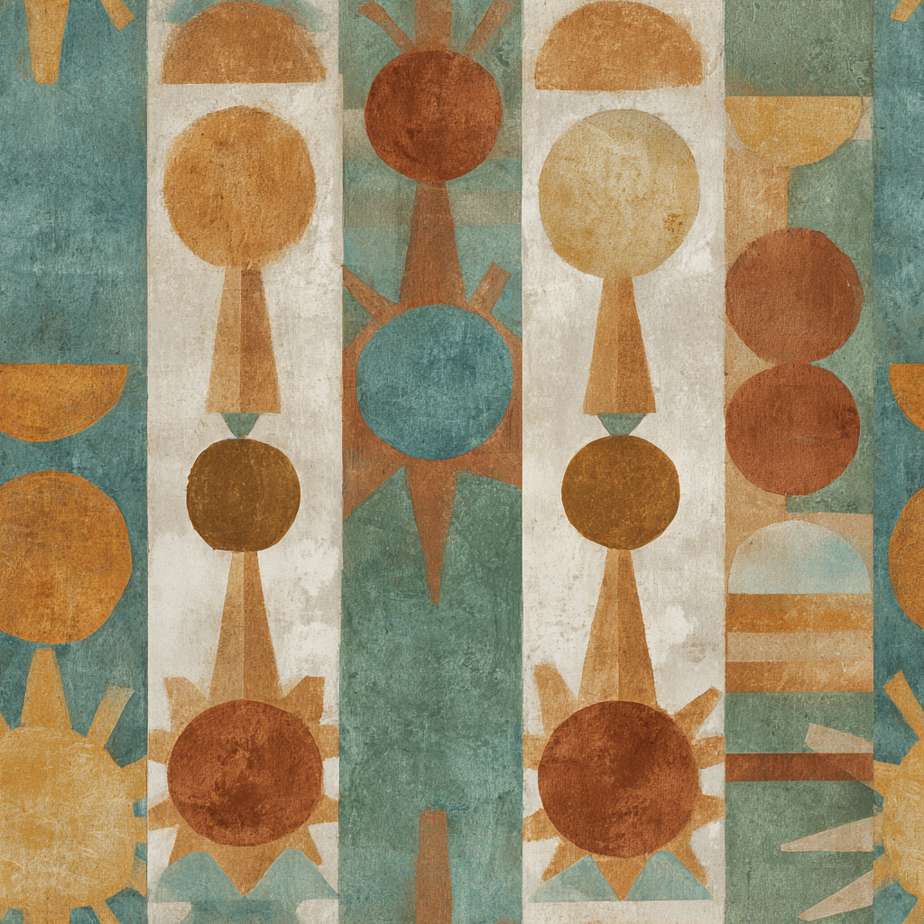 This bold geometric design draws from primitivist sun and moon symbols, arranged in rhythmic vertical bands. Circles, semicircles, and radiating triangles appear in earthy shades of burnt orange, sun-washed yellow, turquoise, and clay red. The repetition feels both ritualistic and graphic, creating a commanding presence that recalls ancient totems or ceremonial carvings. Ideal for accent walls in eclectic living rooms, bohemian dining spaces, or contemporary entryways, this wallpaper balances strong geometry with a hand-painted patina. The palette complements terracotta flooring, rattan furniture, and desert-inspired décor.