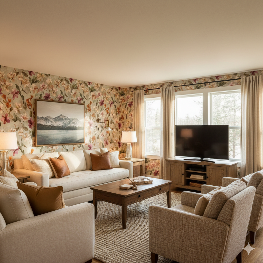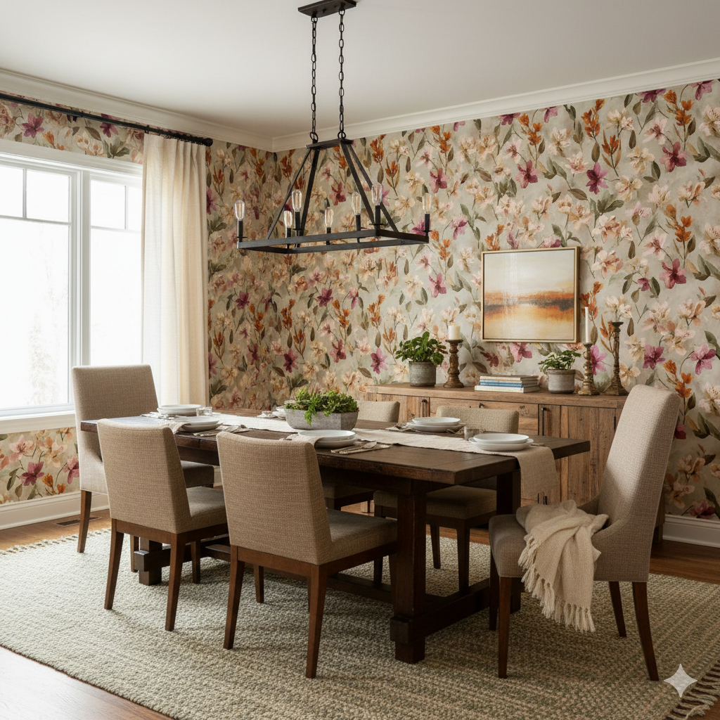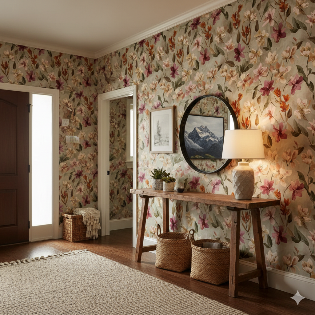 This design bursts with desert wildflowers, drawing inspiration from sego lilies, the state flower of Utah. Petals in soft peach, blush pink, ivory, and deep wine are painted with expressive brushstrokes, layered against a muted taupe-gray background. Rusty orange stems and sage-toned leaves bring autumn warmth to the composition. The arrangement is free-flowing and organic, reminiscent of wild meadows at golden hour. Perfect for bedrooms, sunrooms, or garden-inspired dining spaces, this wallpaper adds romantic energy without being overpowering. Its palette pairs beautifully with warm wood accents, rattan textures, and earthy ceramics.