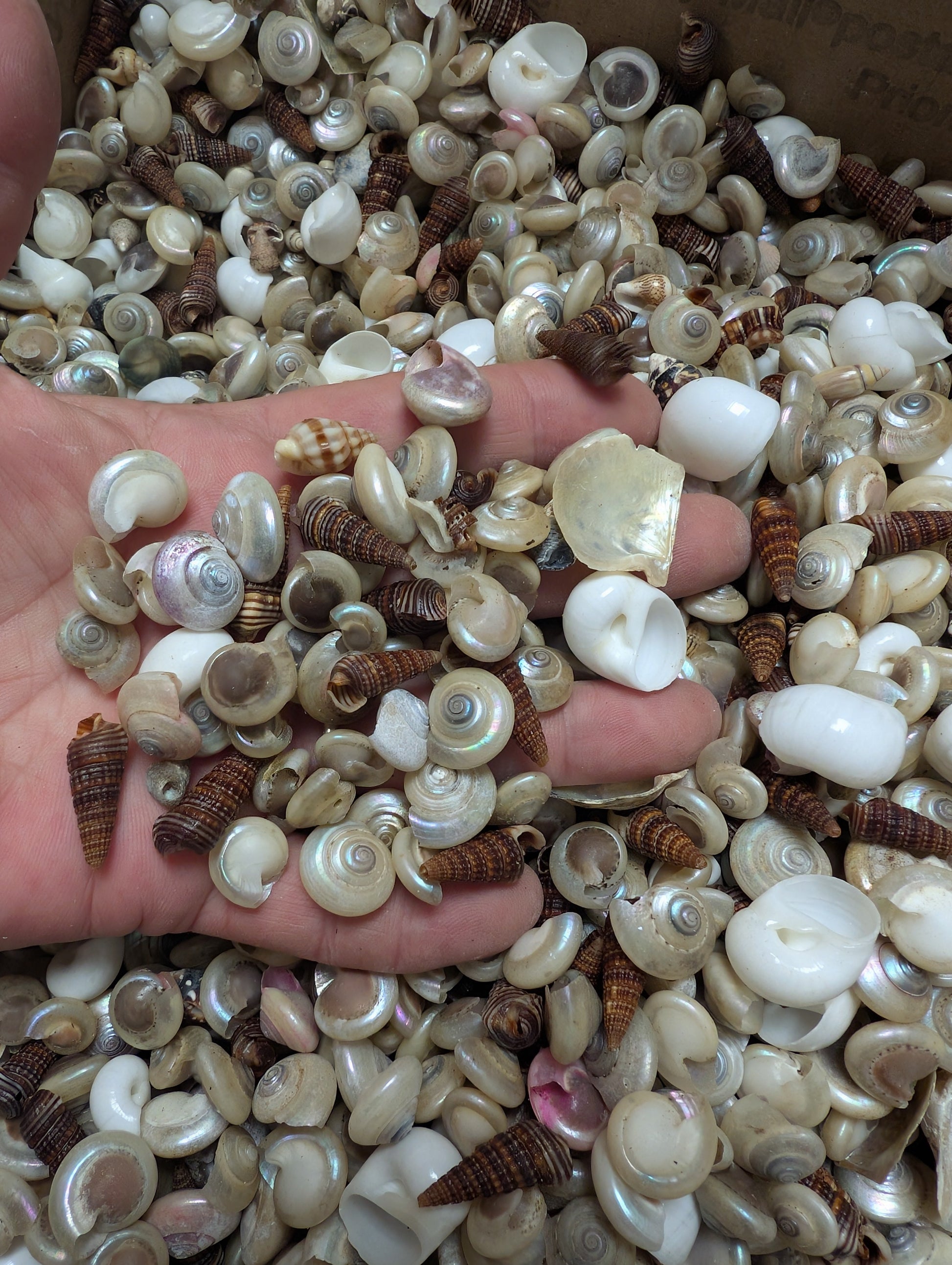 Small specialty mix! Featuring Pearl Umboniums, Brown Augers, White Natica Moon Snails, Dove & Baby Mother of Pearls. This mix will make lovely additions to frames, and any types of sea shell projects. They are used as shell filler when making seashell mirrors, shell ornaments, shell characters and in other shellcraft projects.