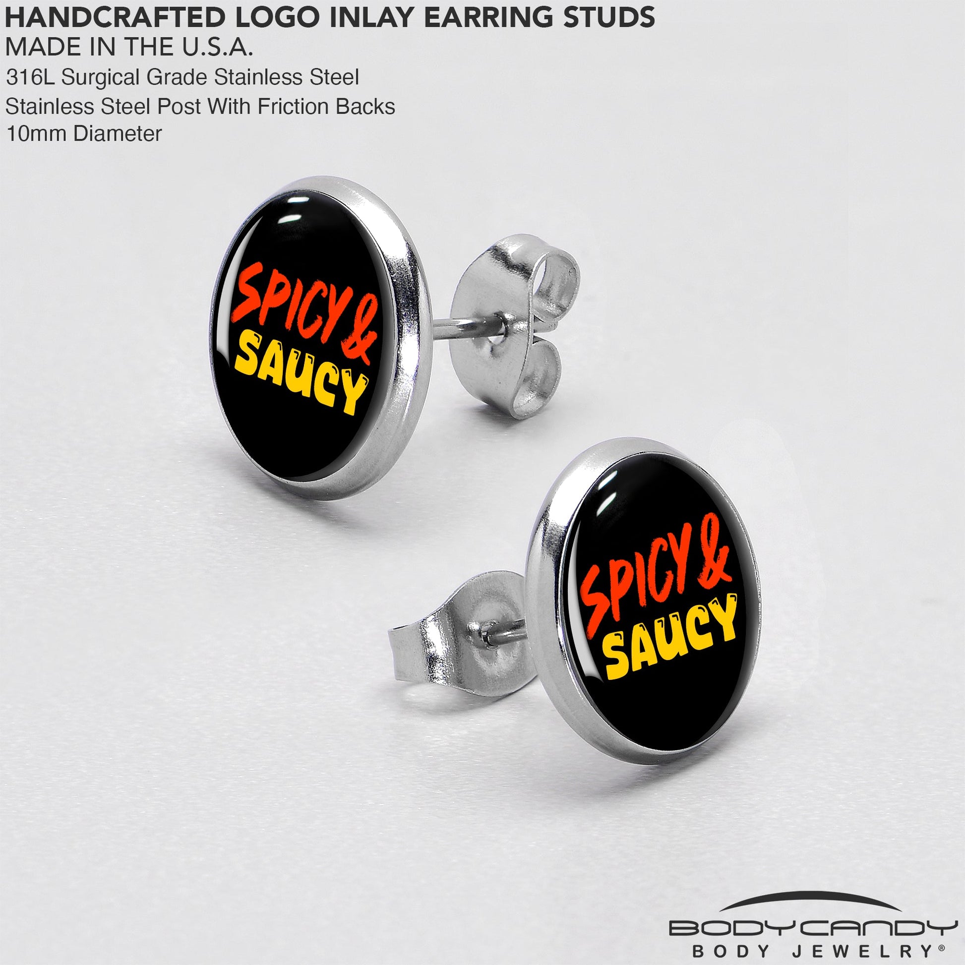 Get a look that's almost too hot to handle with these stud earrings for pierced lobes. These original artist hand drawn earrings are made with stainless steel straight posts with friction backs for a secure fit. They feature a logo that let's the world know that you're spicy and saucy and they're even hypoallergenic. Whether you're feeling frisky or just in the mood for some wings, these spicy saucy pierced earrings are sure to fix your craving. Sold as a set of two.