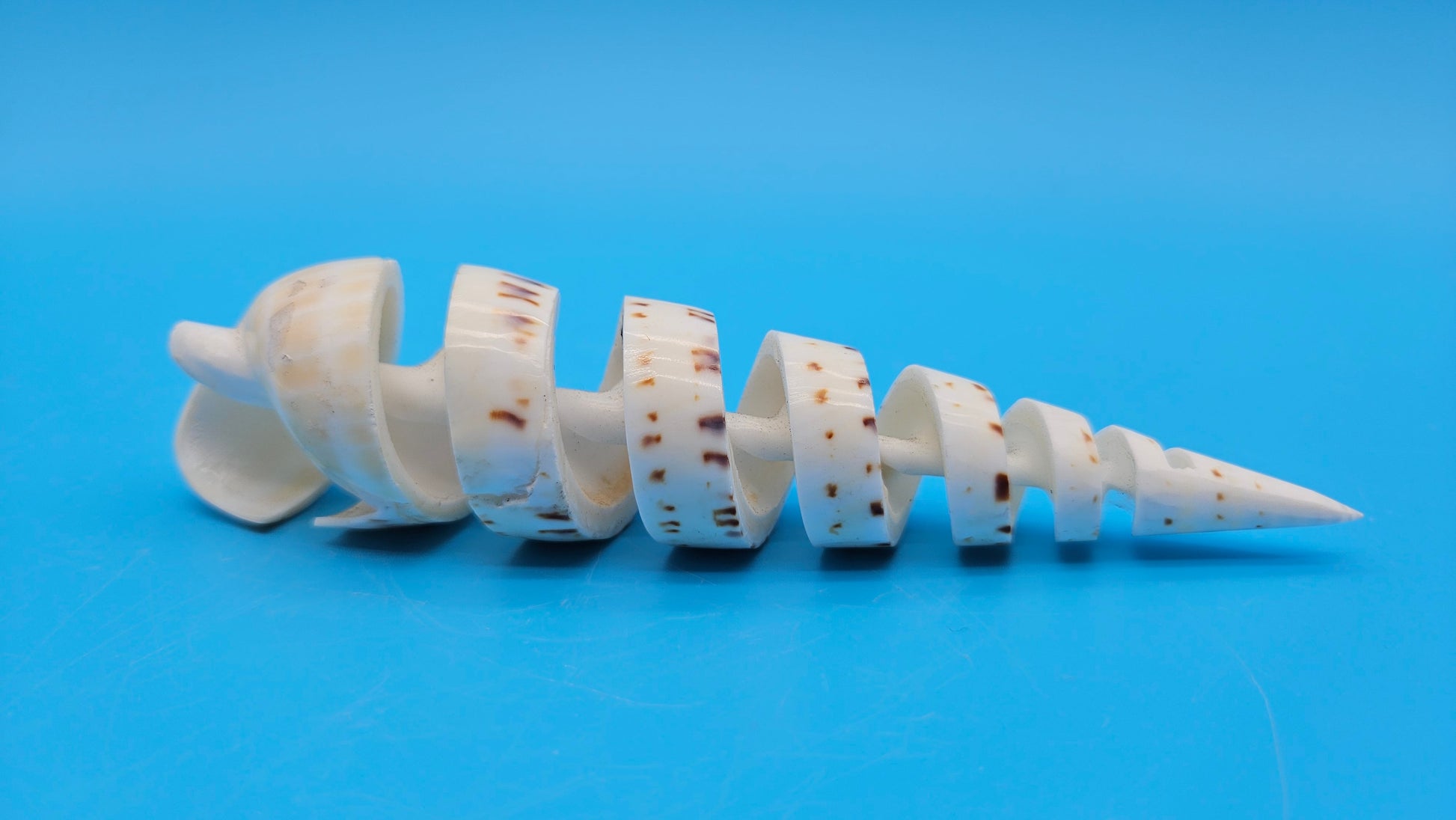 This spiral-cut Marlin Spike shell (Terebra maculata) is a truly striking coastal specimen, transformed into a mesmerizing display piece. Expertly carved to reveal its natural helical structure, the shell’s spiraling form highlights both artistry and nature’s precision.