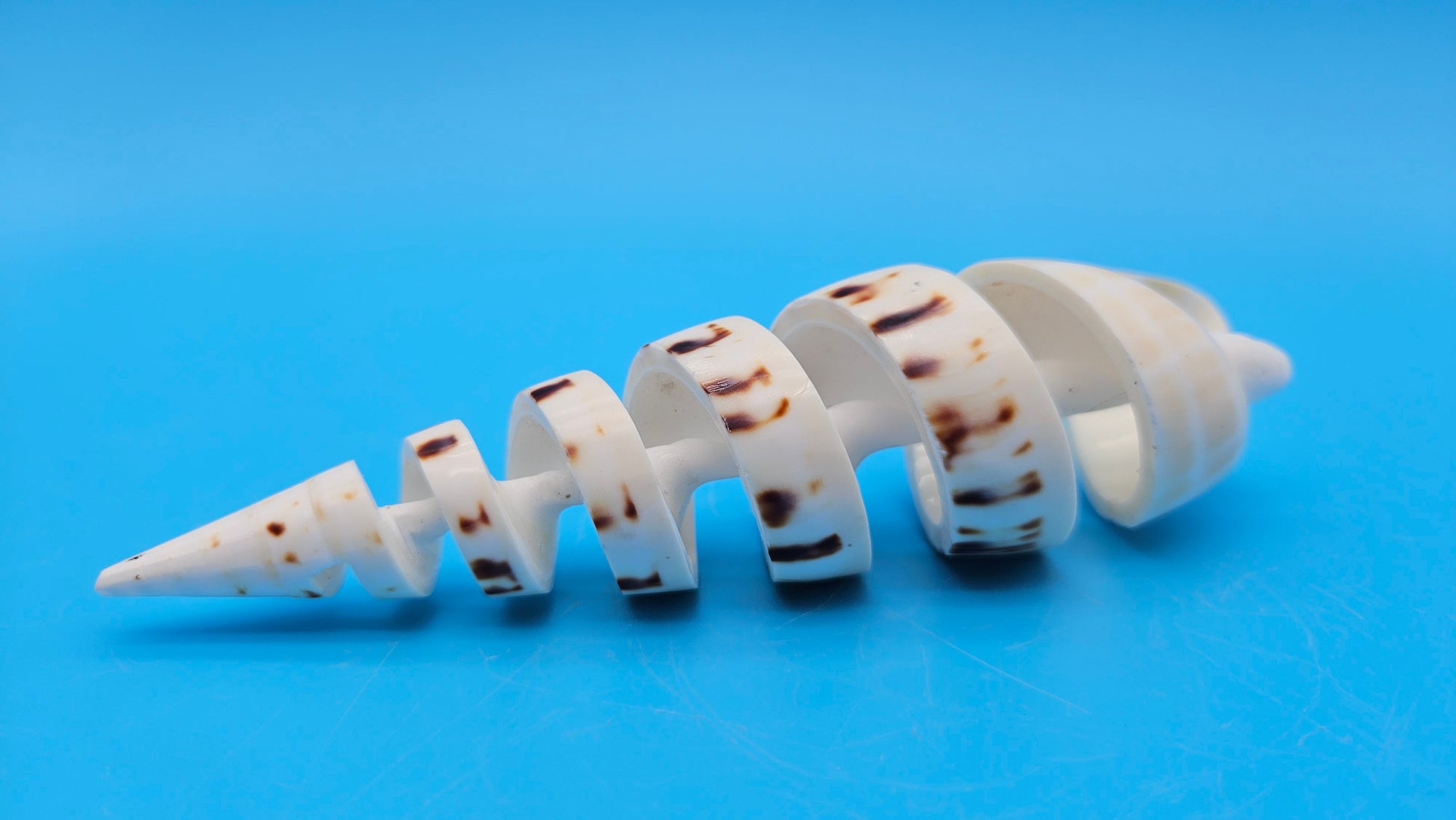 This spiral-cut Marlin Spike shell (Terebra maculata) is a truly striking coastal specimen, transformed into a mesmerizing display piece. Expertly carved to reveal its natural helical structure, the shell’s spiraling form highlights both artistry and nature’s precision.