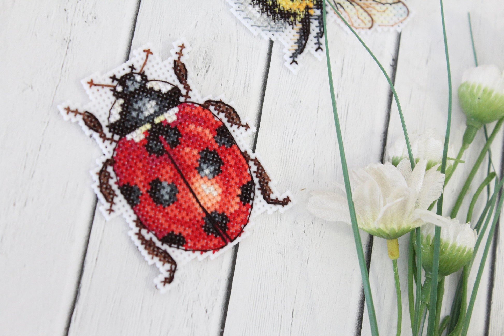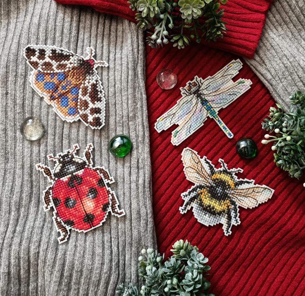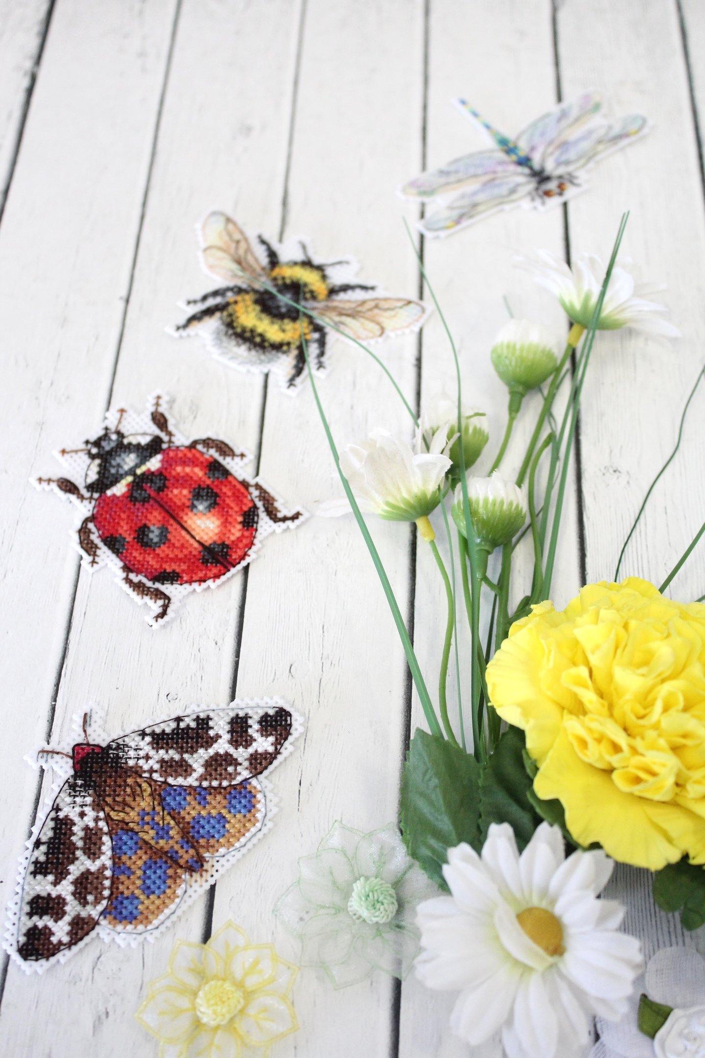 MP Studia counted cross-stitch set of 4 magnets. Cross-Stitch base is plastic canvas and you stitch the back with white felt. Cotton threads. It is new unopened kit. Makes insects - bee, ladybug.