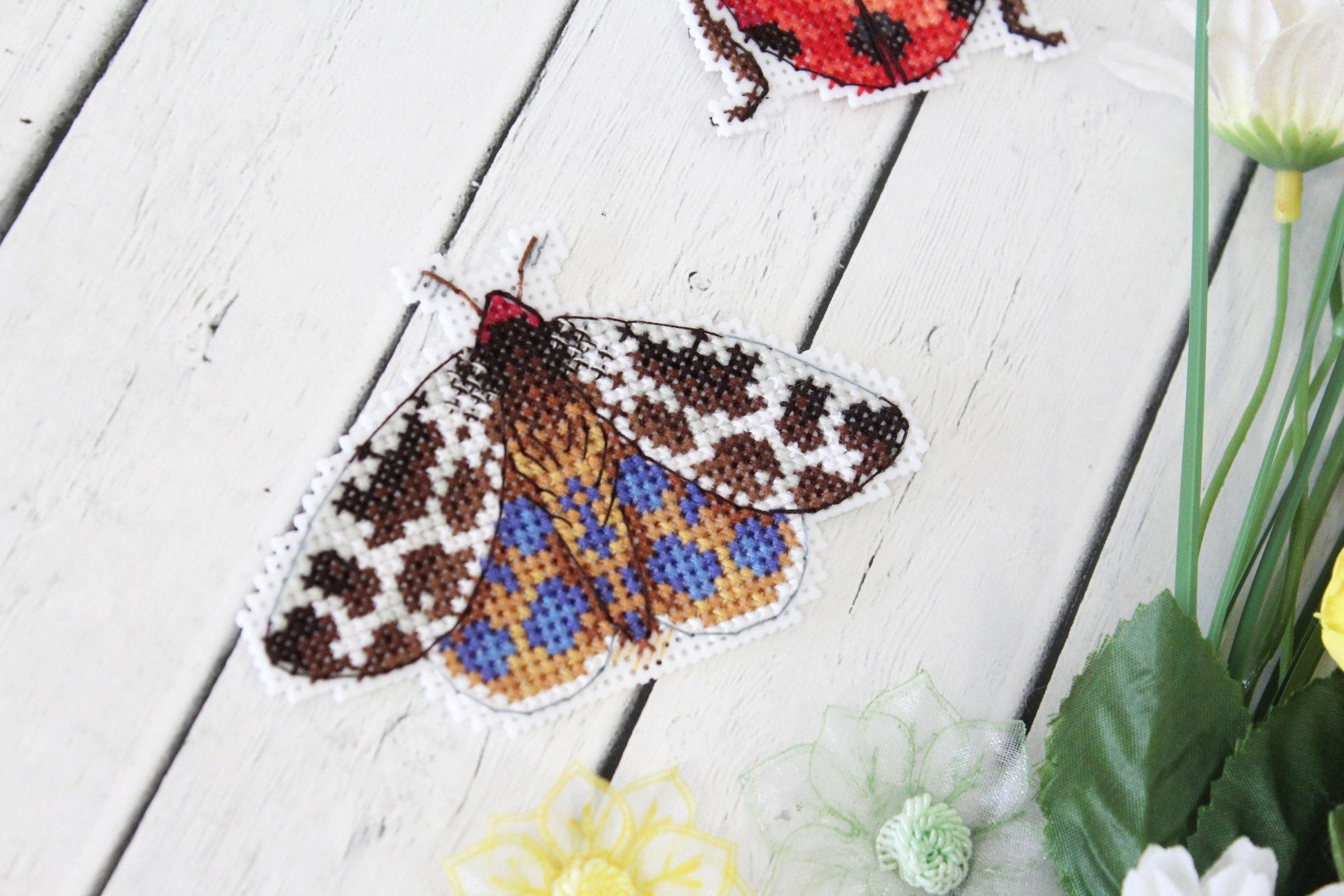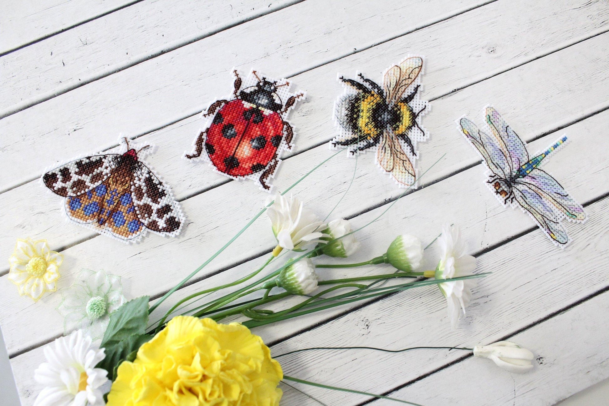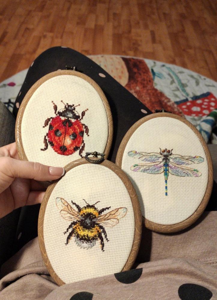 MP Studia counted cross-stitch set of 4 magnets. Cross-Stitch base is plastic canvas and you stitch the back with white felt. Cotton threads. It is new unopened kit. Makes insects - bee, ladybug.