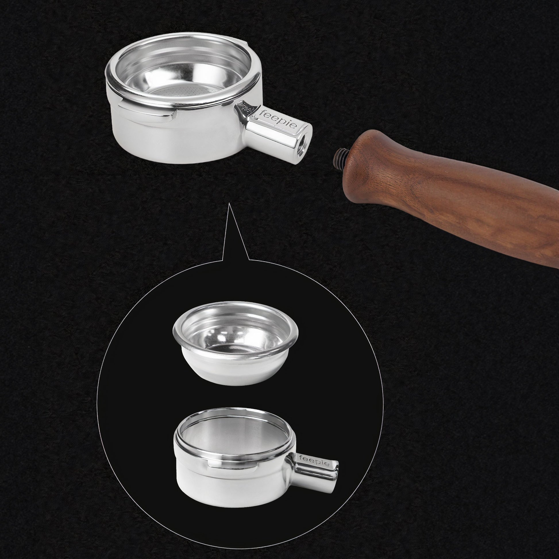 Experience the ultimate precision and control in espresso extraction with our Stainless Steel Bottomless Portafilter, featuring a luxurious walnut handle.