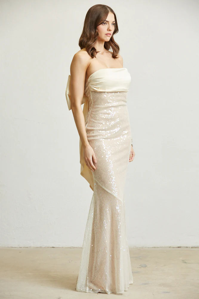 DRESS- ALLOVER SEQUIN TEXTURED MESH FABRIC- STRAPLESS- CONTRAST SATIN BUST OVERLAY- OVERSIZED SATIN BOW TRIM- ASSYMETRICAL MERMAID HEM- INVISIBLE ZIPPER CLOSURE- 100% POLYESTER