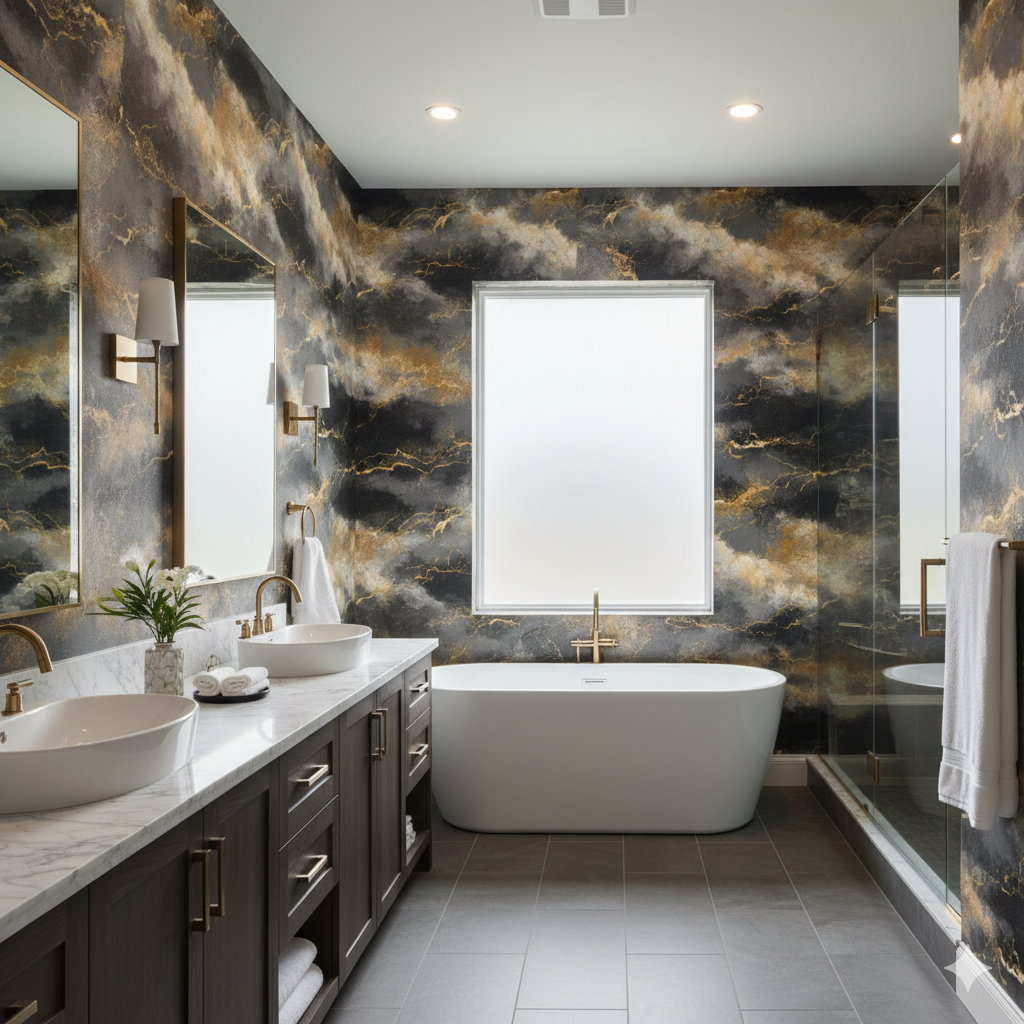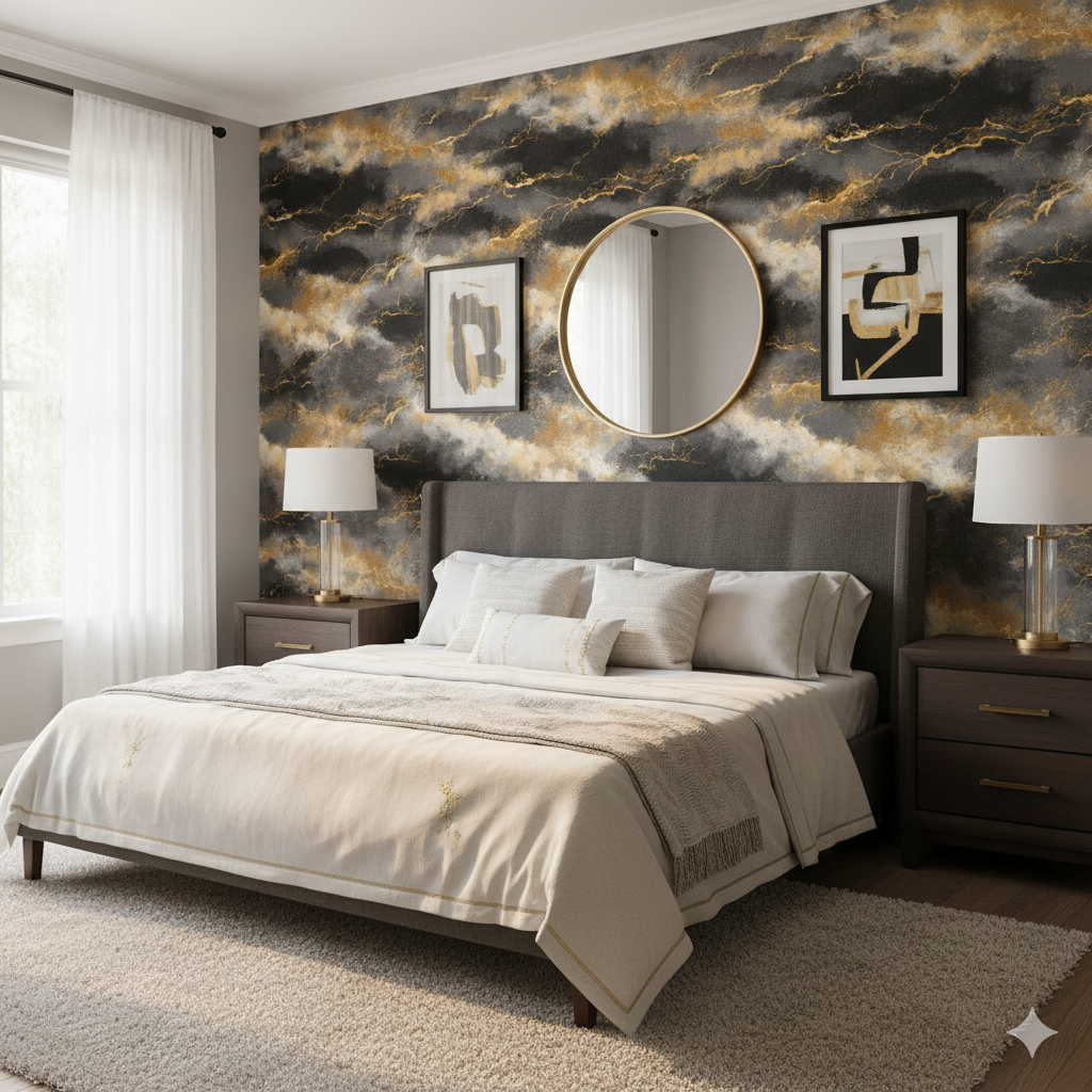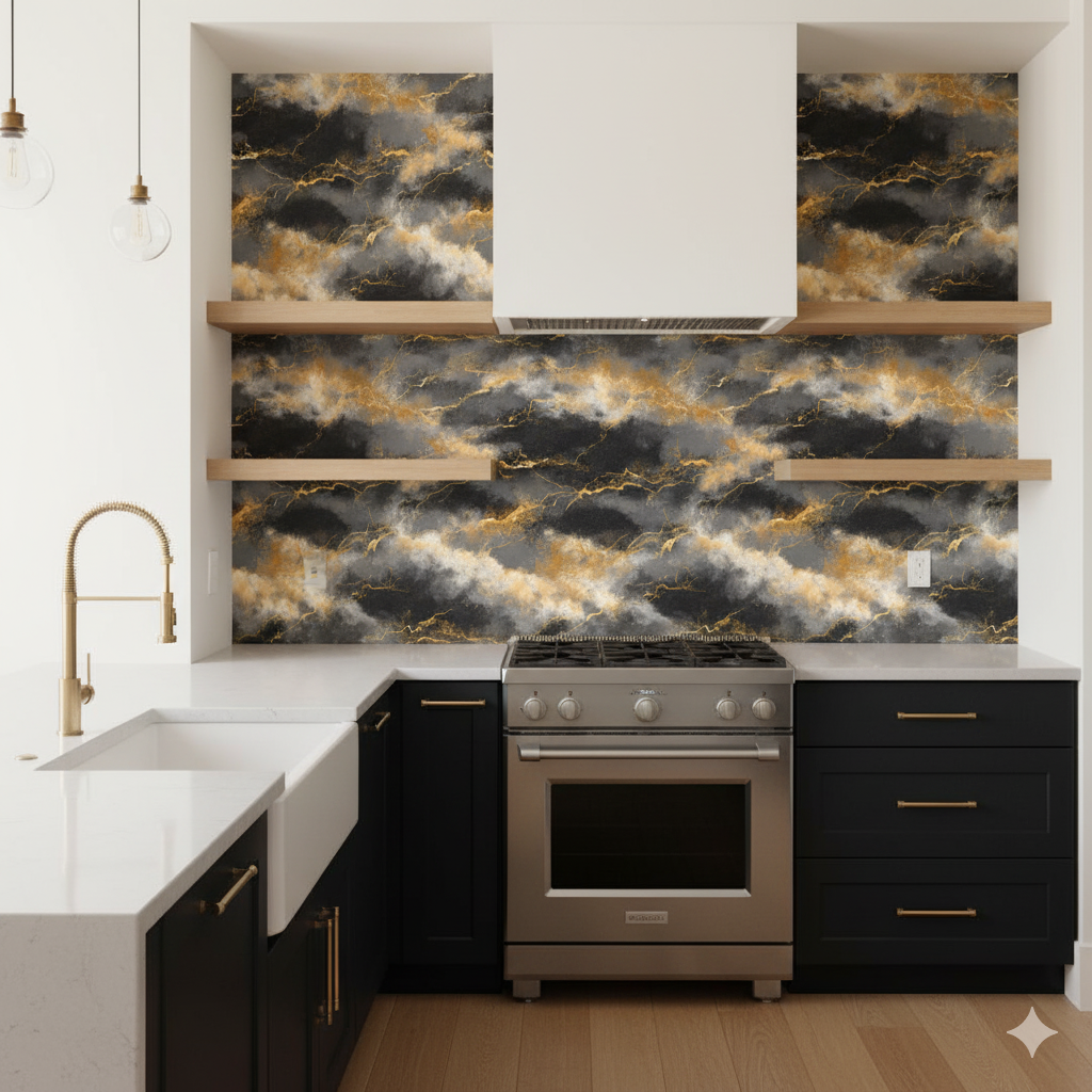 Dark ashen greys and smoky blacks swirl with streaks of molten gold, producing the effect of thunderclouds fractured by lightning. This wallpaper feels alive with atmospheric intensity, its marbled surface constantly shifting between darkness and illumination. The cracked veins of gold resemble fissures of light cutting through storm fronts, lending a sense of grandeur and drama. This design works brilliantly in sophisticated interiors seeking mood and texture — from masculine studies to upscale dining rooms — creating a space that feels both powerful and refined, dramatic yet timeless.