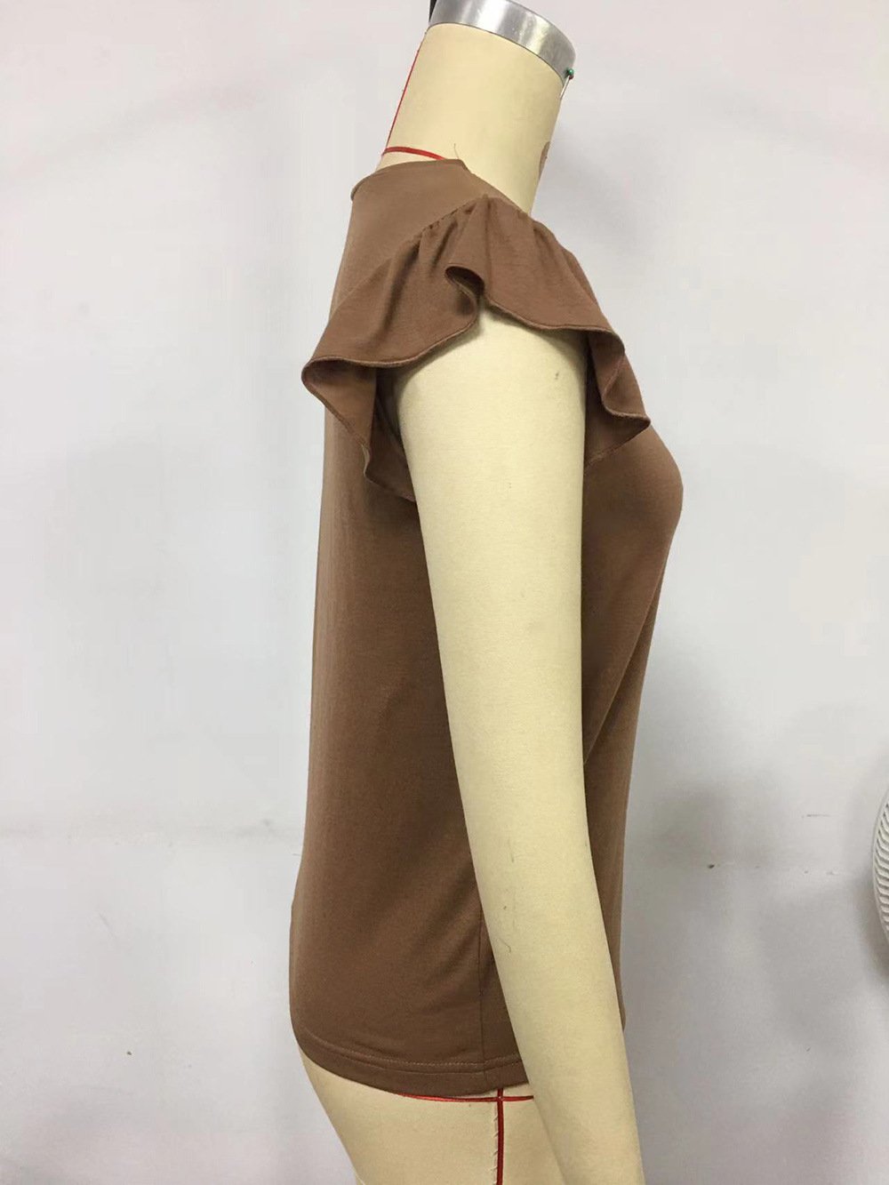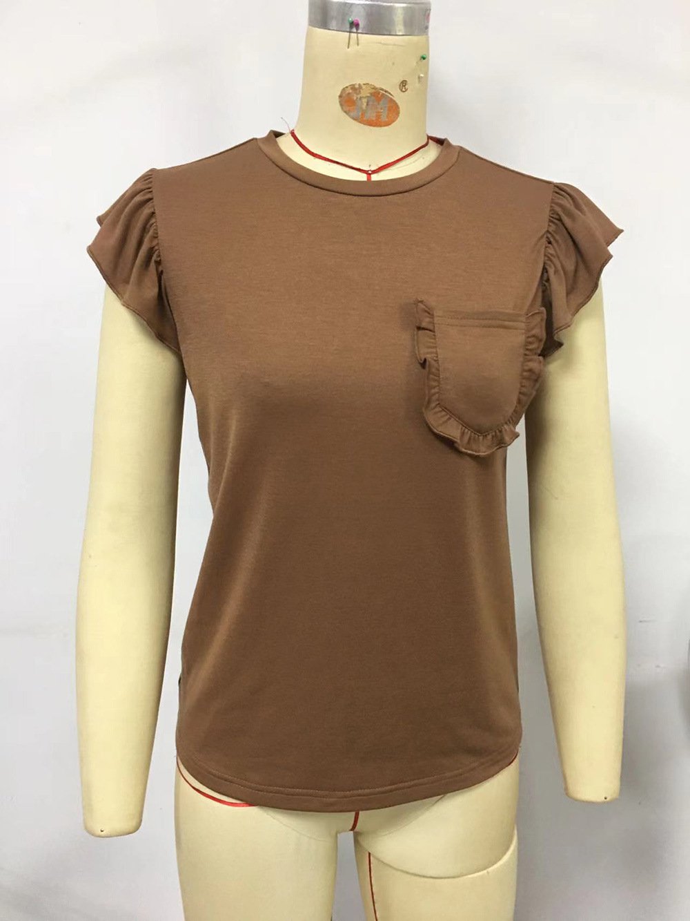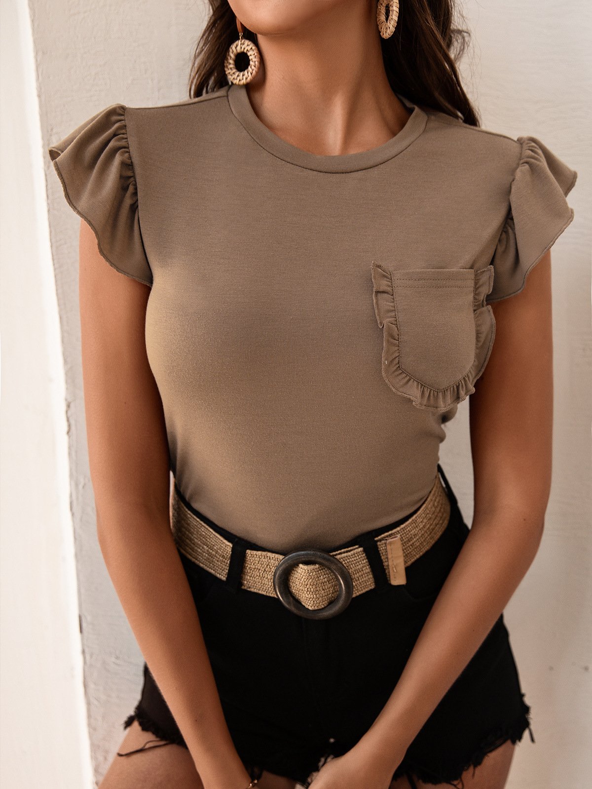 Crafted with a slim fit silhouette, this T-shirt features a round neck and flying sleeves that gracefully enhance your figure. Available in three stunning colors: army green, light coffee, and white, you can easily mix and match with your favorite bottoms to create a variety of looks.