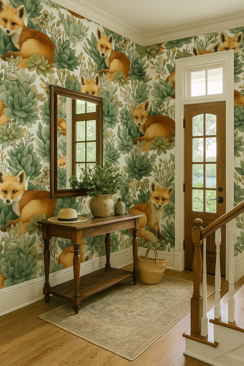 Search terms: desert fox wallpaper, succulent pattern, animal nursery mural, watercolor animals and plants.