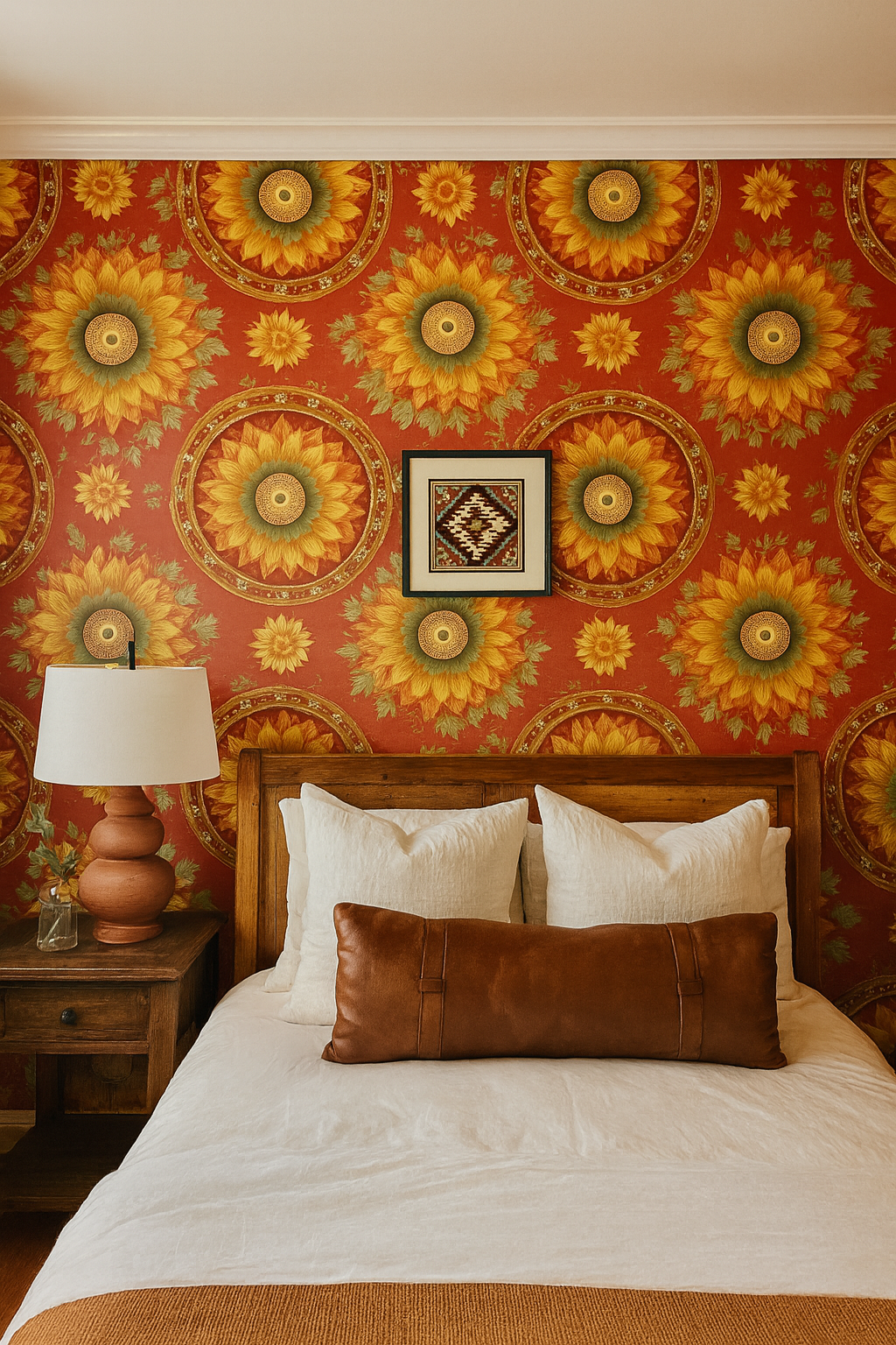 “Sunburst Sonata” is a bold and radiant wallpaper featuring stylized desert sunflowers arranged into mesmerizing mandalas. Dominated by golden yellows, earthy oranges, and sage greens, the design bursts from a deep terracotta red background. Intricate floral motifs and radial symmetry give this piece a regal, almost celestial quality. Ideal for accent walls, dining areas, or creative studios, this pattern infuses warmth, vibrancy, and cultural richness into any space seeking a Southwest or boho-luxe aesthetic.