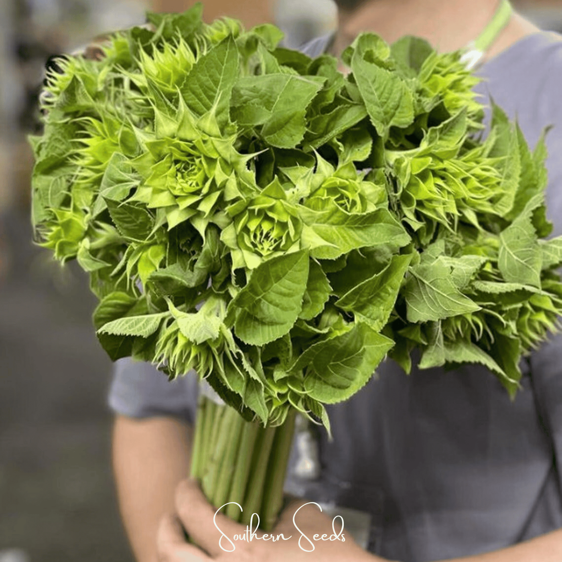 Grow a unique and modern floral design element with our SunFill Green Sunflower seeds. This stunning hybrid is grown not for its petals, but for its large, upward-facing, petal-less flower head, which forms a beautiful, textural, green calyx. A favorite of high-end florists, SunFill Green provides incredible texture and a unique look to bouquets and arrangements. The tall, sturdy stems are pollen-less, making for a long-lasting and mess-free cut flower.