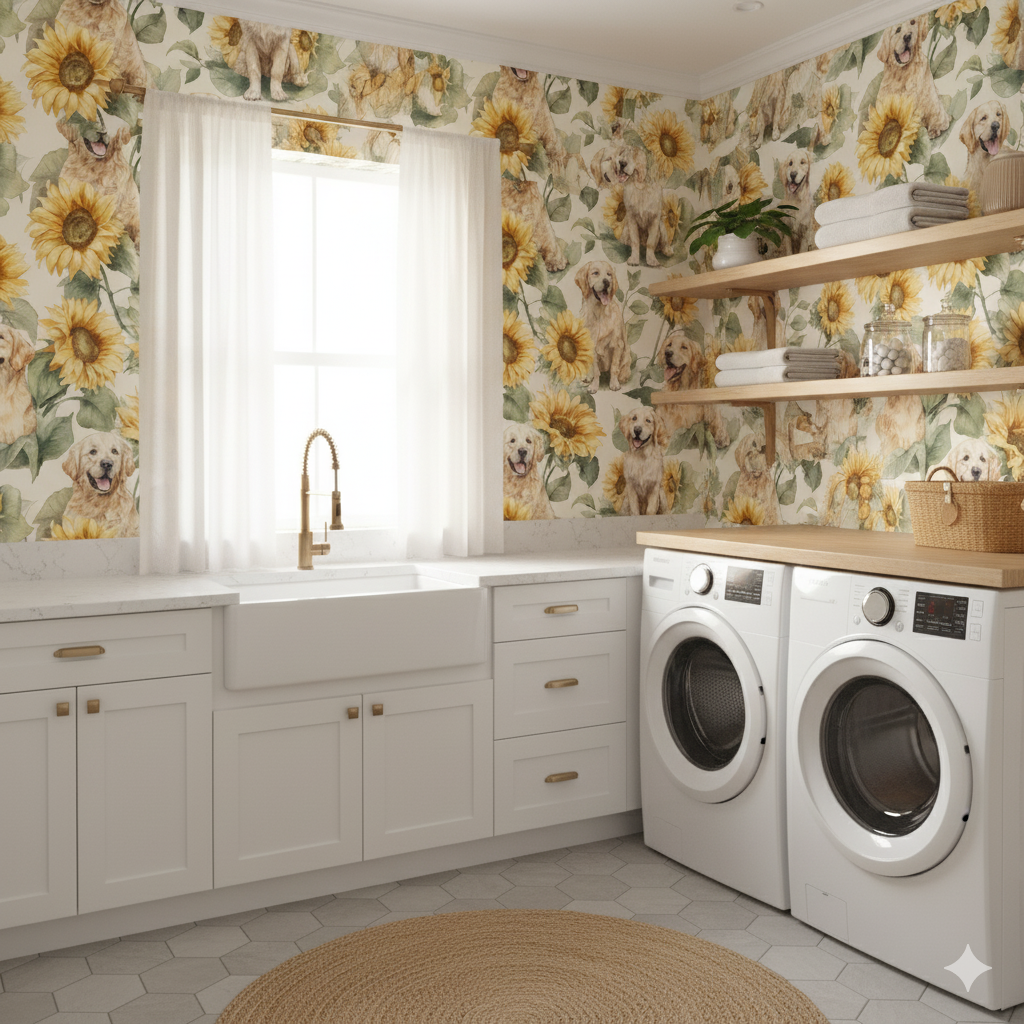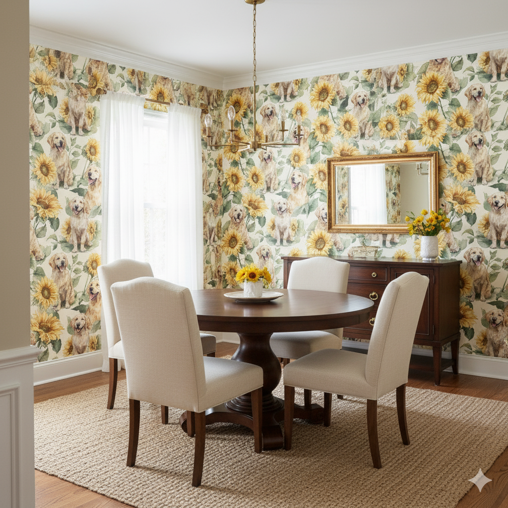 Golden retrievers, rendered with watercolor realism, smile among towering sunflowers painted in sunny yellows and leafy greens. This wallpaper radiates warmth, friendliness, and cheer, making it an instant fit for family rooms, mudrooms, or children’s spaces. The golden tones harmonize with the dogs’ coats, reinforcing a sunny, positive aesthetic. It is ideal for those who want to bring joy and brightness into their interiors, with an unmistakable canine twist. Search-friendly phrases include "golden retriever wallpaper," "sunflower dog wall mural," and "bright cheerful wallpaper with dogs."