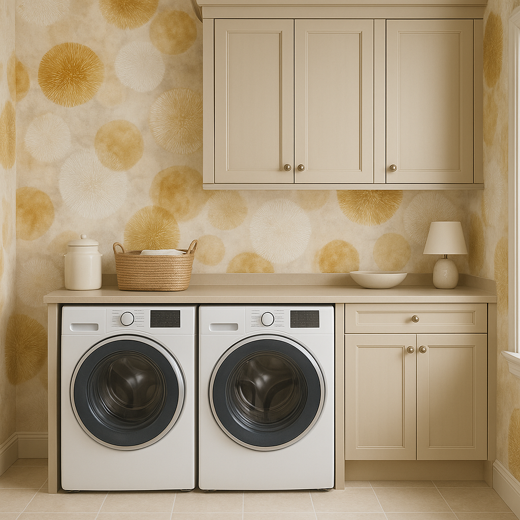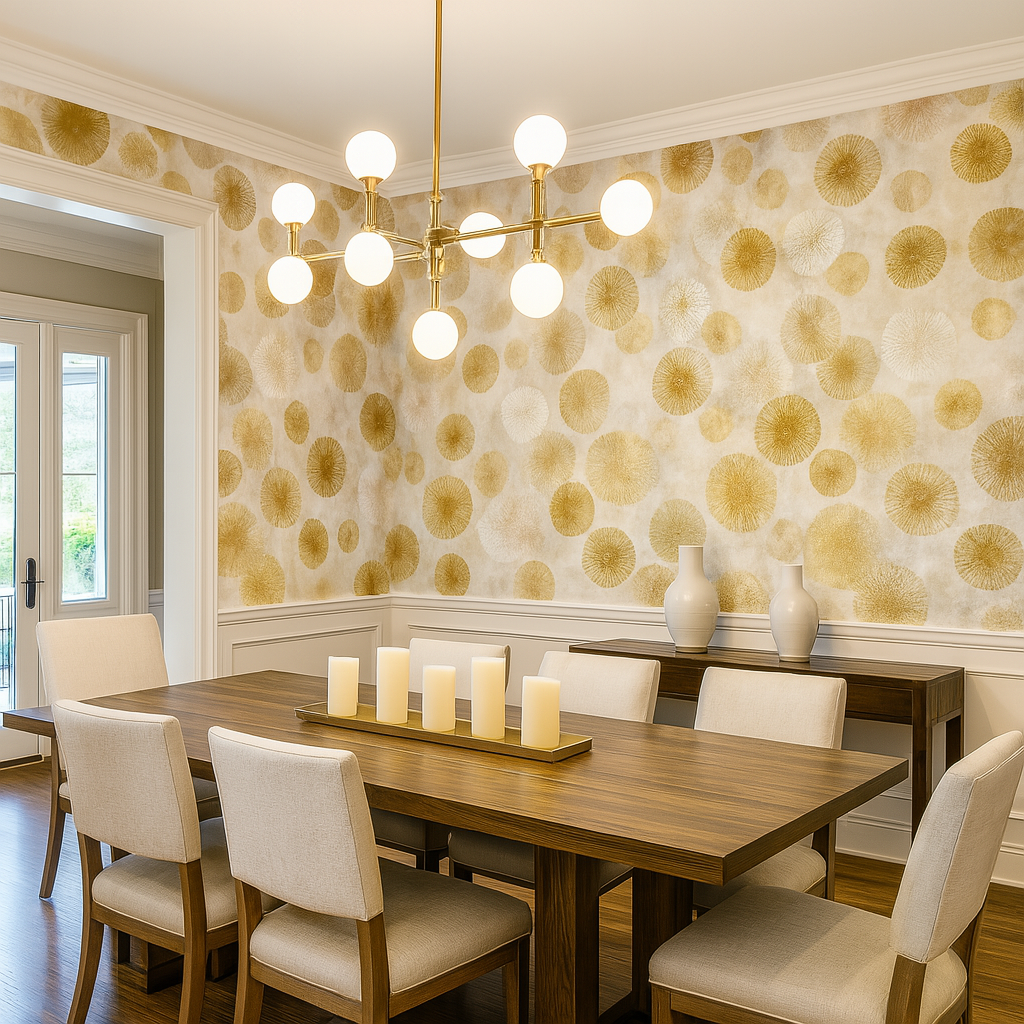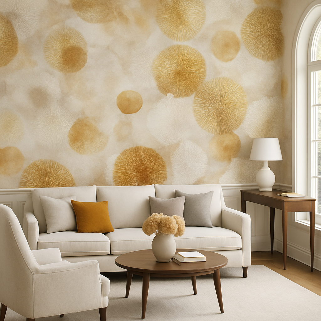 Inspired by microscopic pollen structures, Sunspore Bloom is a nature-based wallpaper design reimagined as a field of golden dandelion-like bursts. Each circular motif is detailed with fine lines and radiant depth, rendered in warm tones of amber, ivory, ochre, and honey. This abstract botanical wallpaper is ideal for those who want subtle movement with a hint of golden warmth. Use it as an accent wall in a neutral nursery, a sunlit kitchen, or a refined bohemian home office. The textural quality adds dimension to modern neutral interiors.