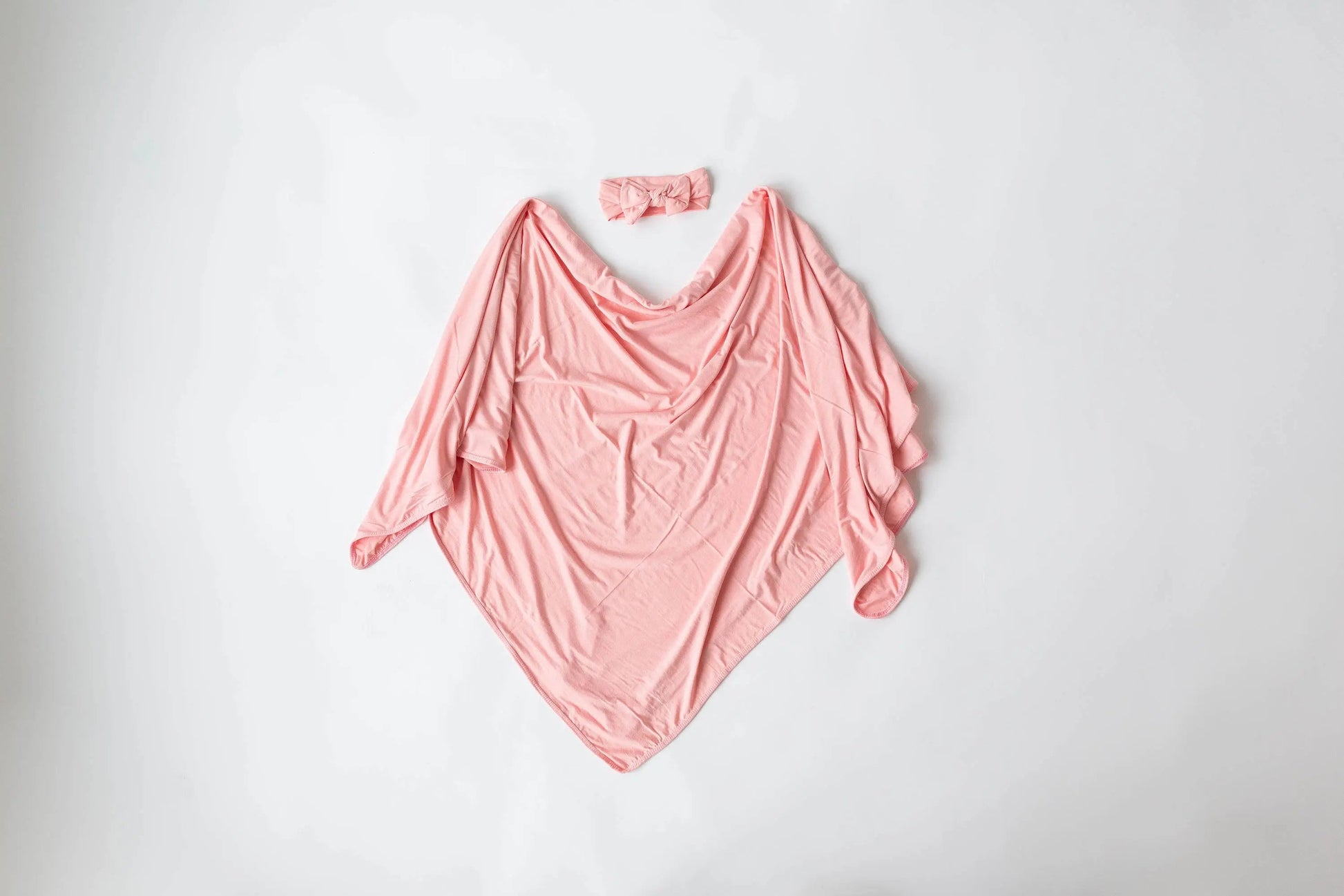The Stroller Society pink stretch knit swaddle blanket, hat and headband are extremely soft, lightweight and breathable. The baby blanket’s large 47” by 47” size makes it perfect for swaddling, useful as a receiving blanket and it can also be used into the toddler years. The newborn headband and hat are ideal for infants ages newborn to 3 months old and looks great in photos! This bundle is perfect for baby girls and makes the perfect baby gift!