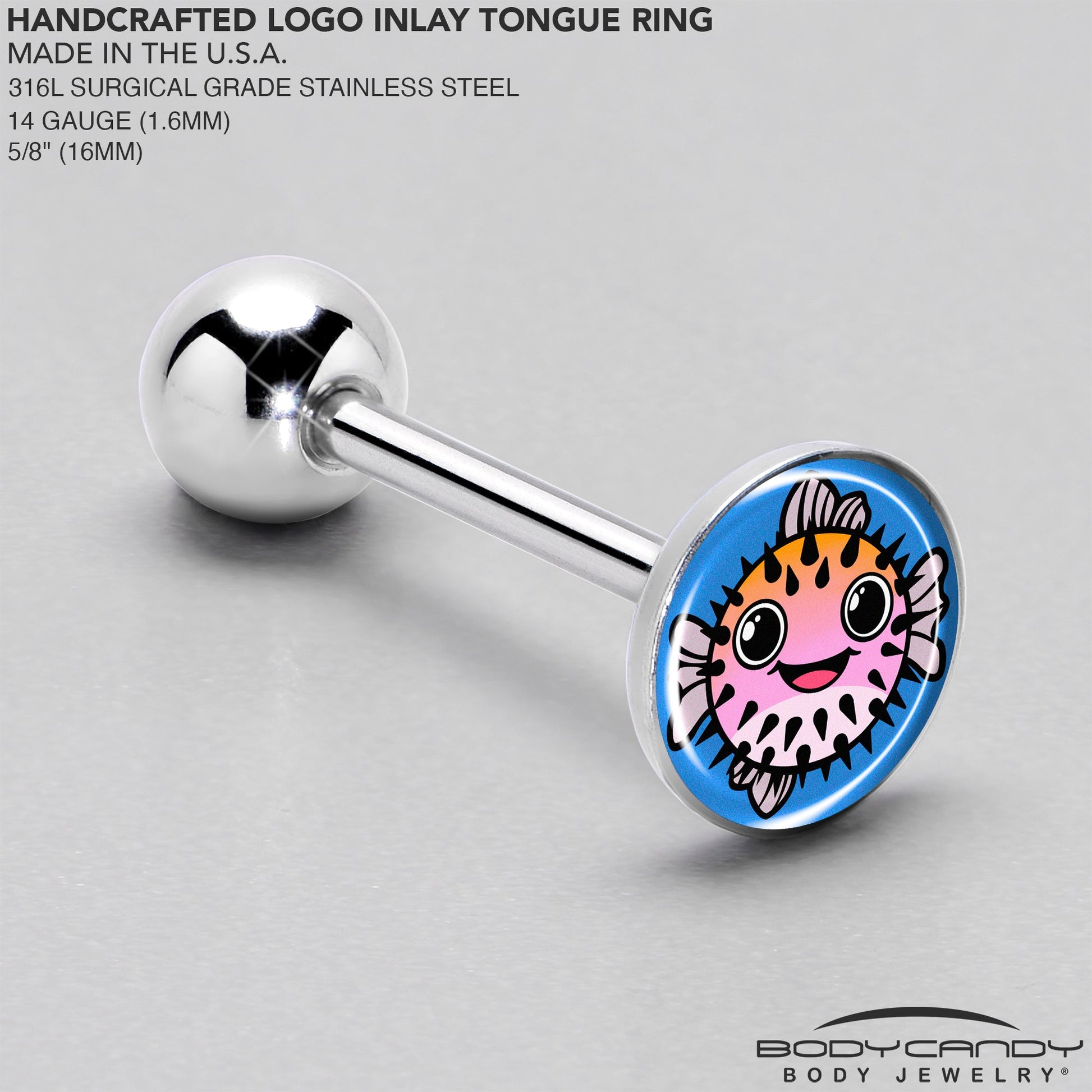 Danger never looked so sweet as it does on this 14 gauge stainless steel tongue jewelry. It's made with a 5/8 inch 316L surgical grade stainless steel straight barbell with a 6mm bottom ball end. The top end features a blue disc logo charm. It features a pink and orange pufferfish, with large eyes and a winning smile for a look you simply can't resist. This whimsical pufferfish stainless steel tongue piercing jewelry is sure to win you over. Unique artist-drawn logo inlay design surgical steel tongue ring.