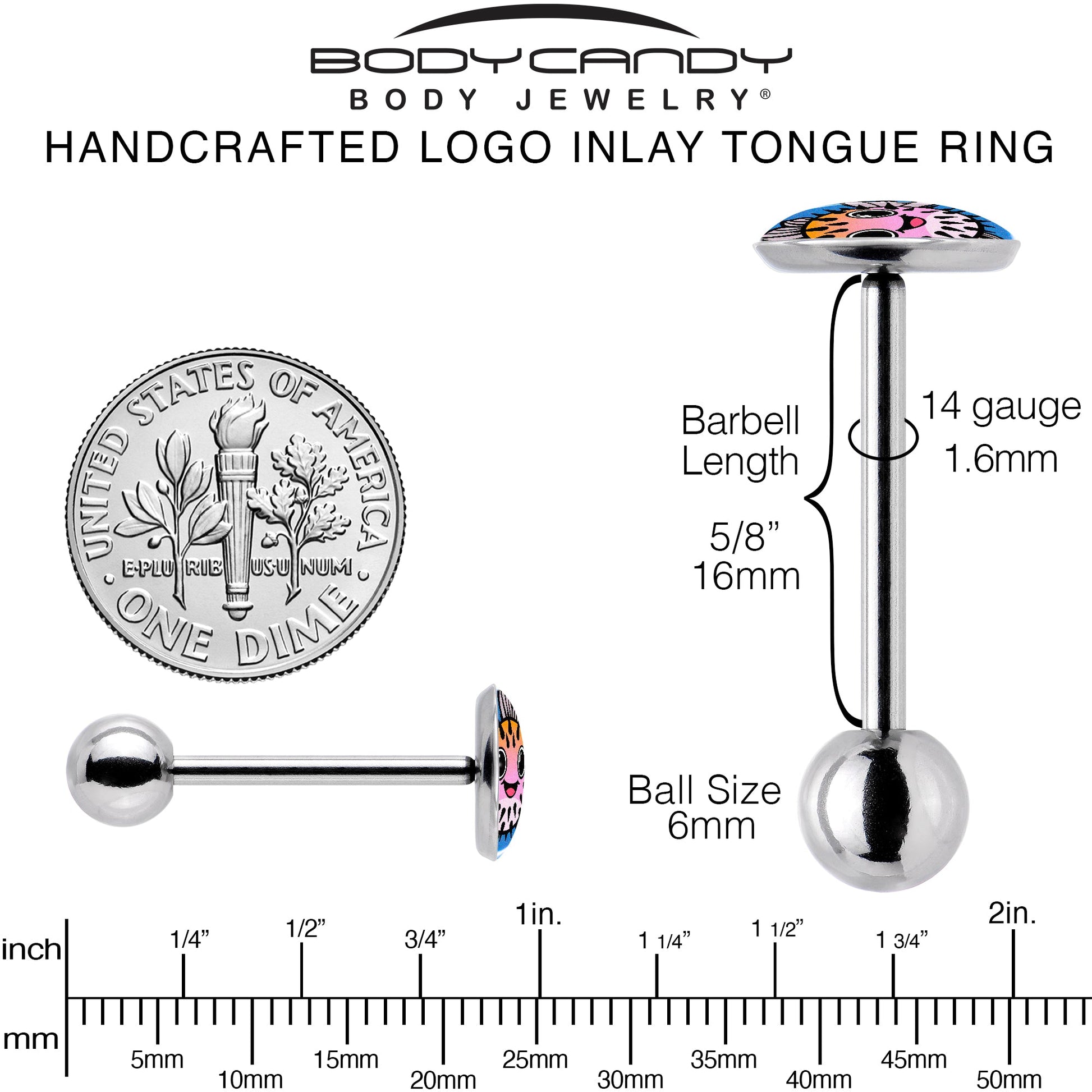14 Gauge (1.6mm), 5/8" (16mm), 9mm Logo Inlay, 316L Surgical Grade Stainless Steel, 6mm Ball